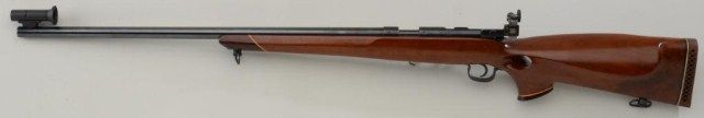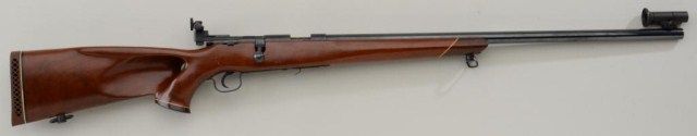 Stevens Model 416 bolt-action target rifle, .22LR cal., 26” heavy X barrel, re-blued finish, custom target thumb hole wood stock, no magazine, hooded front sight and adjustable Redfield receiver mounted rearpeep sight, #1150 with top of receiver also stamped “NG”. This gun is in overall good condition showing the majority of its re-blued finish, very good bore, crisp action, very good wood stock, White Line hard rubber butt pad; a fine quality target rifle. Est.: $125-$250.