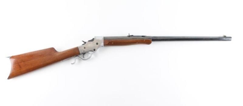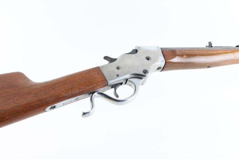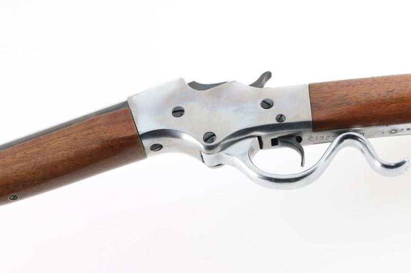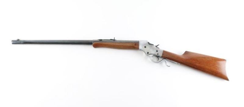 Single shot falling block rifle with external hammer and finger lever. Features nickel or chrome plated action and buttplate, other metal parts blued, smooth wood schnabel forend, straight gripped stock with crescent buttplate, 24" half round half octagon barrel, blade front & sporting rear sights. Bore is good to very good condition, slightly dark with strong rifling. Retains 80% re-blue, with edge losses and some discoloration, rounding of edges during polishing before reblue. Bright plated parts are very good condition overall with some cloudiness, some slight orange peel texture on flats, dishing around screw holes. Wood is very good overall with dents & dings, good fit to metal, small cracks at rear edge of upper tang. Marked 'C132784' in electric pencil behind trigger Condition is NRA Very Good+ (as refinished) *** C&R Firearm ***