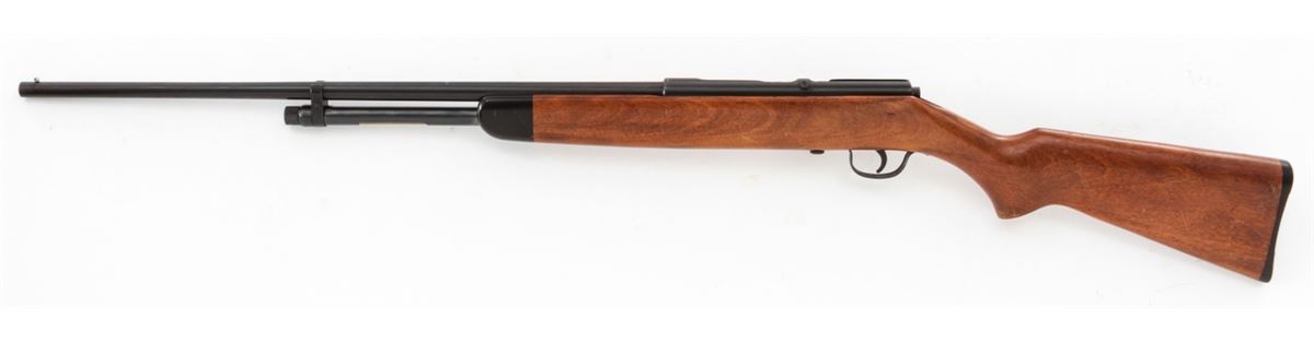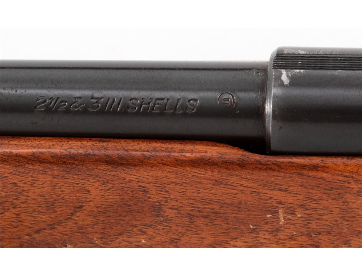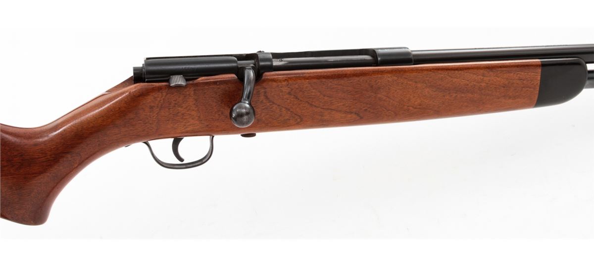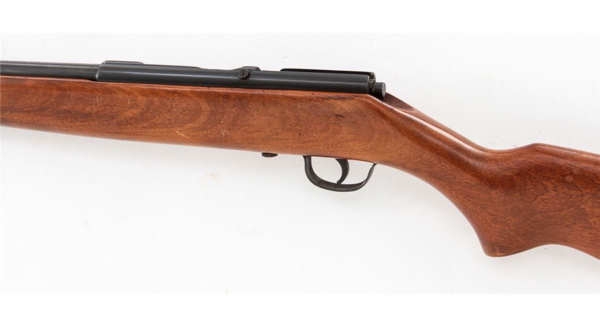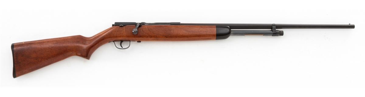 Stevens Model 59B Bolt Action Tube-Fed Shotgun, NVSN, .410 ga., 24'' barrel choked Full, blue finish, walnut stock, with factory black plastic buttplate. Condition is about fine retaining approx. 95% original finish. Stock shows moderate field use with light scuffs and scratches. Good action, bright bore. Est.: $200-$400. (C&R)