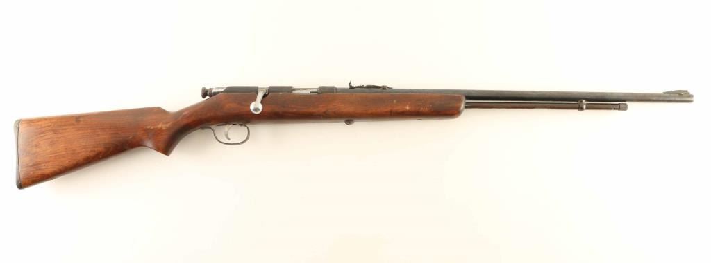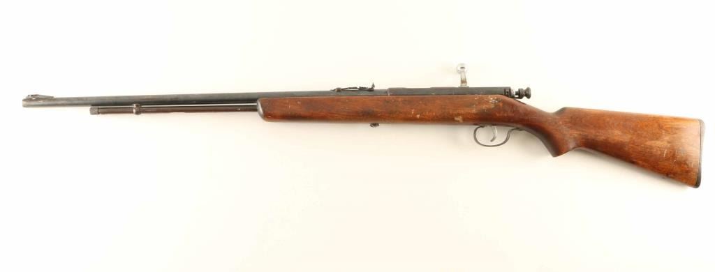 'Buckhorn Rifle' Vintage American made tube-fed bolt action sporting rifle chambered for .22 Short, Long or Long Rifle, manufactured circa 1930's. Features a blued finish, 24" round barrel, 3/4 length tube magazine, front sight ramp(missing insert), adjustable rear sporting sight, provisions on the receiver for a side mounted sight, chromium plated bolt, smooth trigger, metal trigger guard, knurled cocking piece, and smooth wood pistol grip shoulder stock with serrated black hard rubber buttplate. Rifle retains approximately 50% of it's original blued finish showing thinning, scattered wear/scratches, and a small amount of light surface rust. Action is sound, the bore appears excellent but is dirty and the wood stock is good with blemishes & holes from previously installed swivel studs. Condition is NRA Fair to Good. ***C&R Firearm***