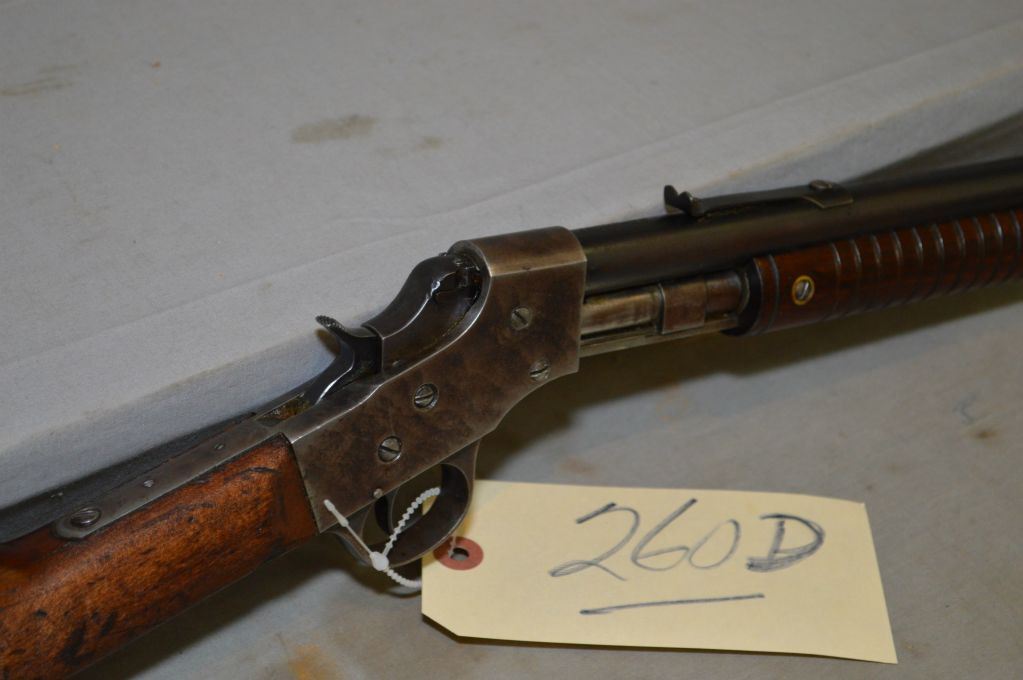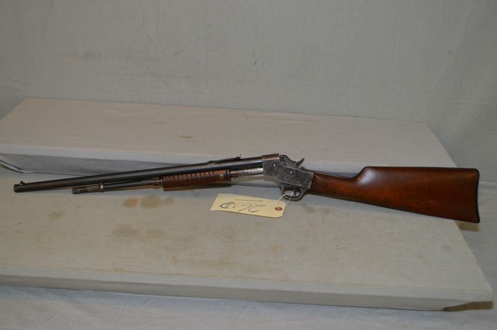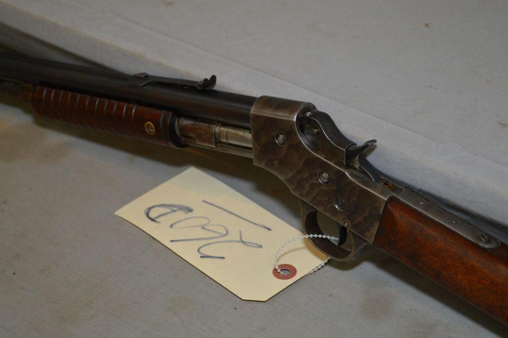 Stevens Model 70 Visible Loading .22 Short ONLY Cal Tube Fed Pump Action Rifle w/ 20" rnd bbl [ blued finish starting to fade with barrel sights, case color receiver, also starting to fade, straight walnut stock w/grooved forend wood, checkered butt plate ] Ser # X450