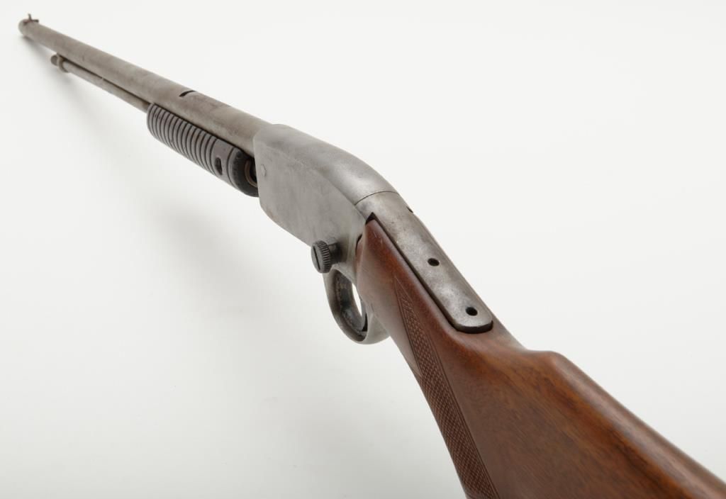 Stevens Model 75 pump action rifle, .22 short, long and LR cal., 24” round barrel, wood stocks, #12366. This gun is in overall fair condition showing a brown patina on previously cleaned metal surface, action is not working, bore is rough,replaced butt stock is overall good; a project or parts rifle. Est.: $150-$300.
