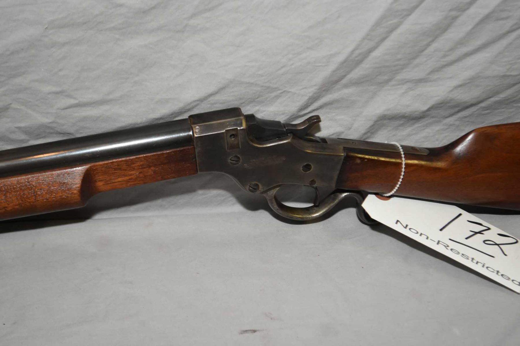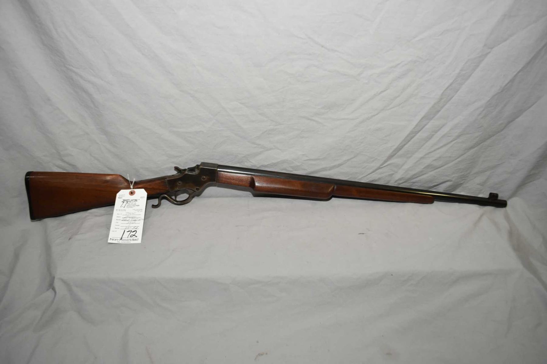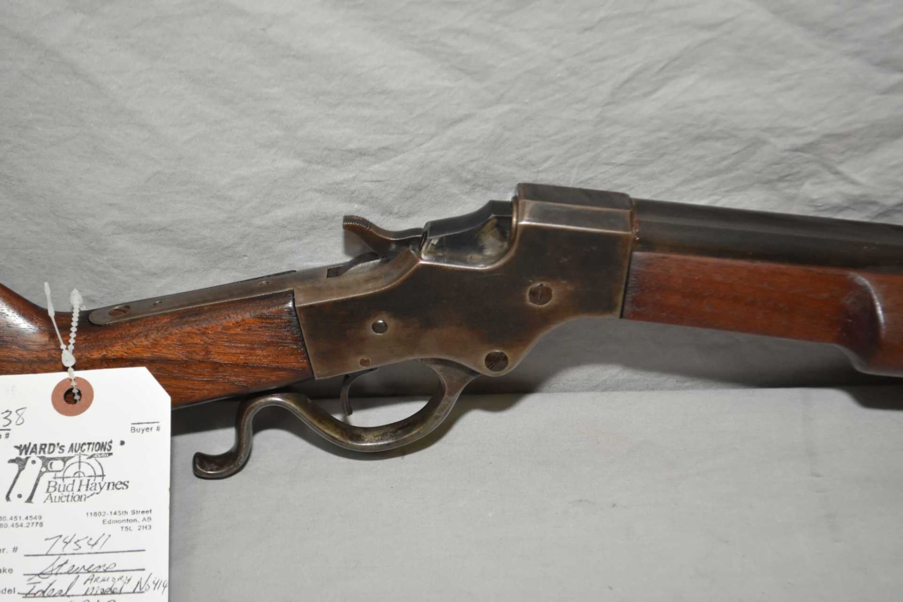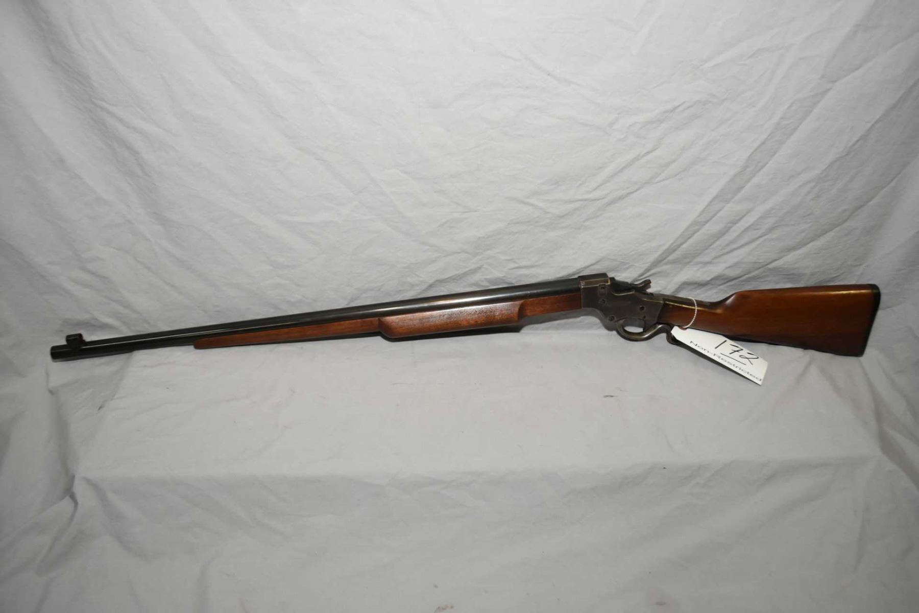 Stevens Model Ideal " Armory Model " No. 414 .22 LR Cal Single Shot Rifle w/ 29" replaced barrel with hooded sight [ faded receiver appears to have been lightly varnished, tapped for tang sight, missing the lyman receiver rear sight, straight stock with black plastic butt plate, unusual 3/4 length forewood ] Ser # 74541