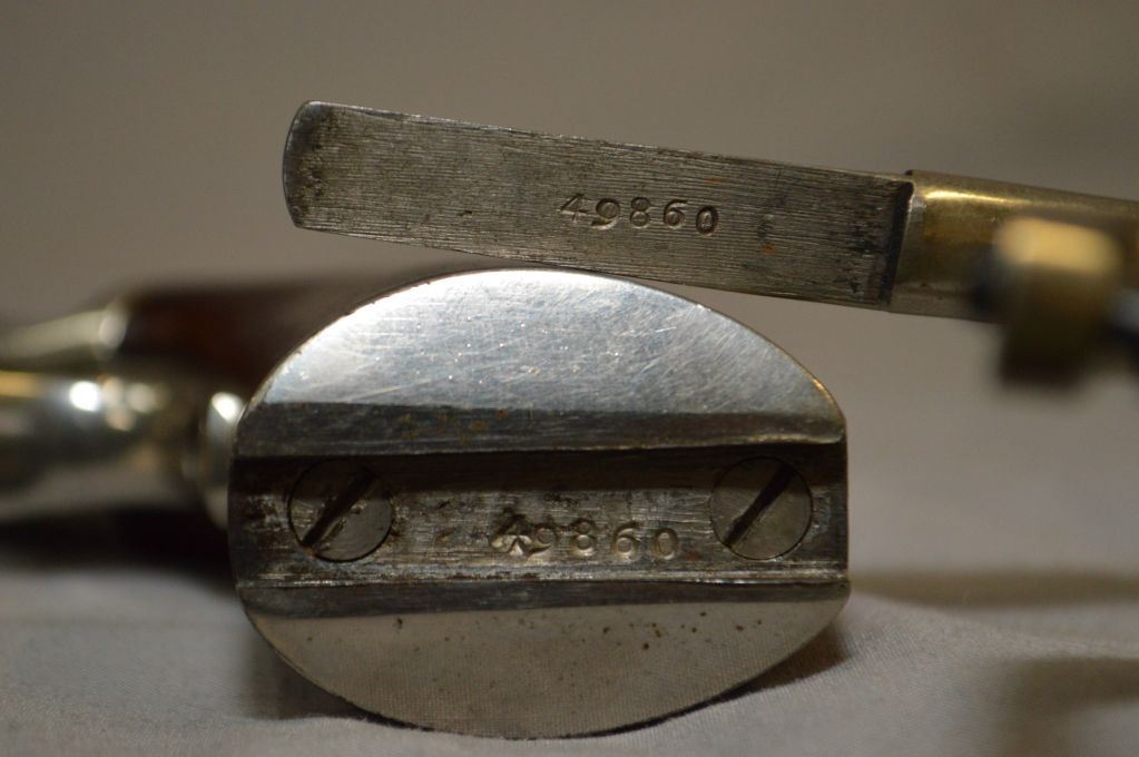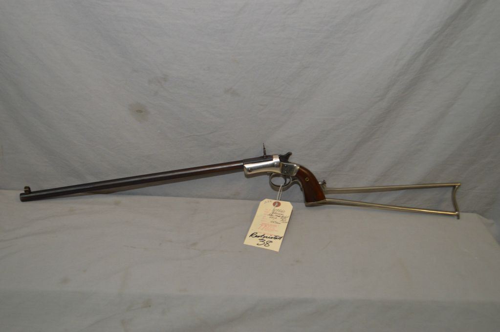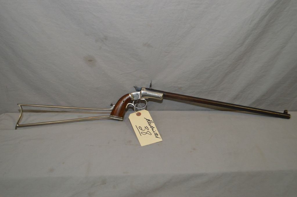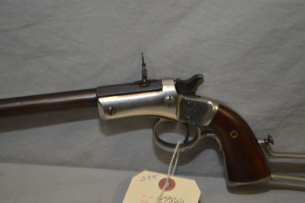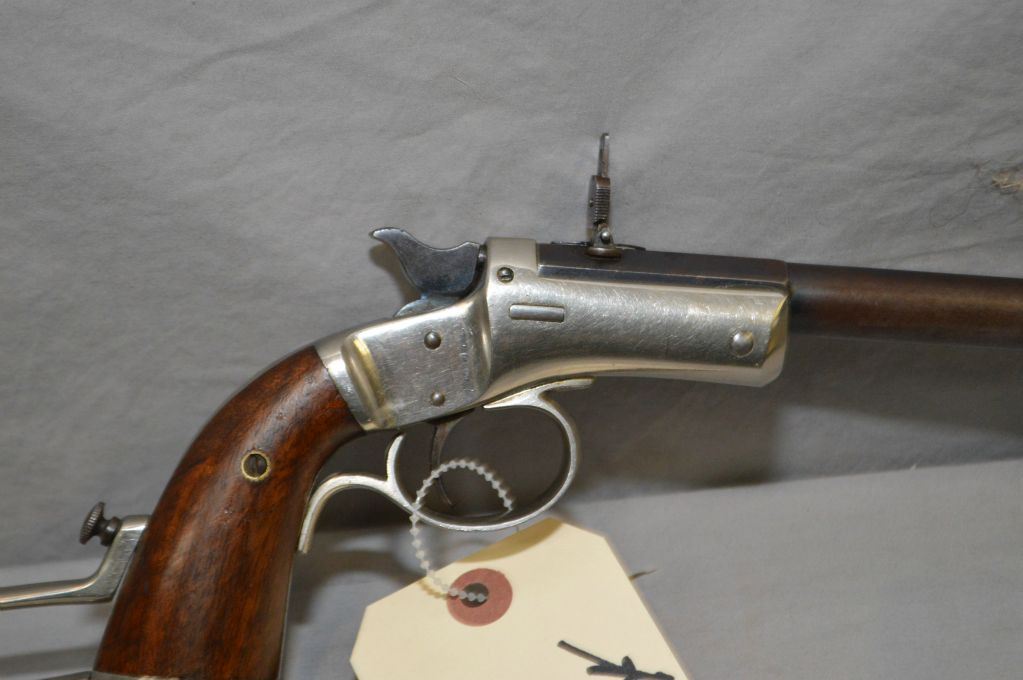 Stevens Model New Model Pocket Rifle 2nd Edition ( firing pin mounting in the frame with a bushing, rather than on the hammer itself ) .22 LR Cal ? Single Shot Pistol w/ 457 mm bbl [ blued finish starting to fade in carry areas and turning brown, target style barrel sights, good nickle finished receiver & grips, matching numbered detachable metal skeleton stock ] Ser # 49860 Restricted Handgun Cert # 15252765