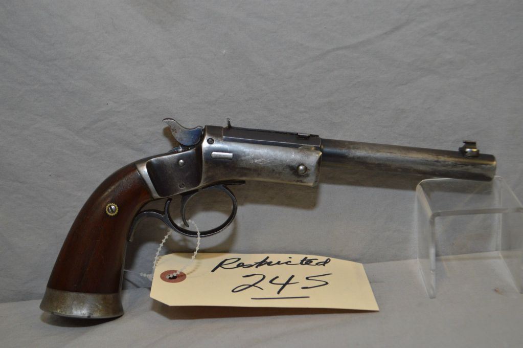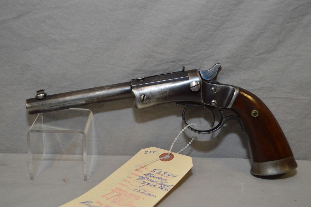 Stevens Model Off - Hand Target No. 35 .22 LR Cal Single Shot Pistol w/ 152 mm bbl [ blued finish, shows some fading wear from holster, also on front & back straps, case colored hammer & trigger, walnut grips, barrel sights missing the back lift ] Ser # 52844 Restricted Handgun Cert # 6167697