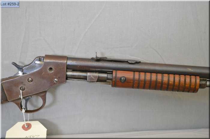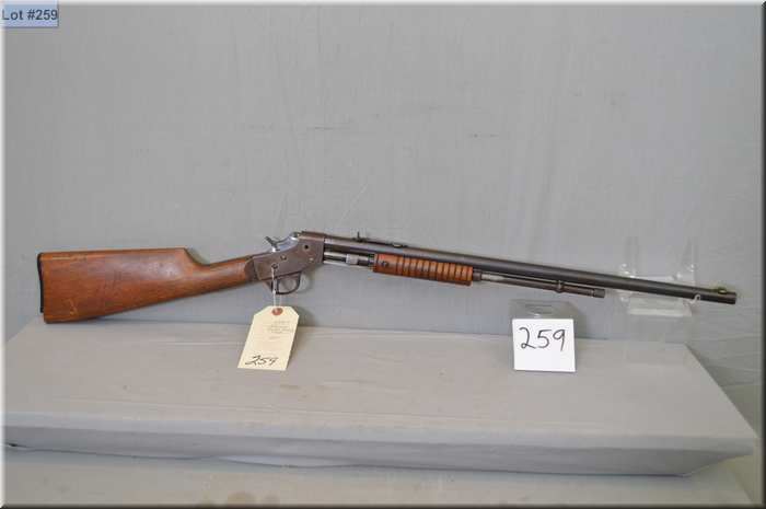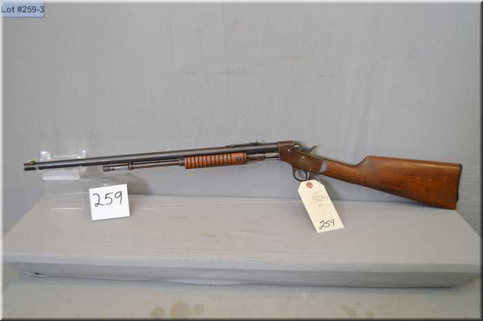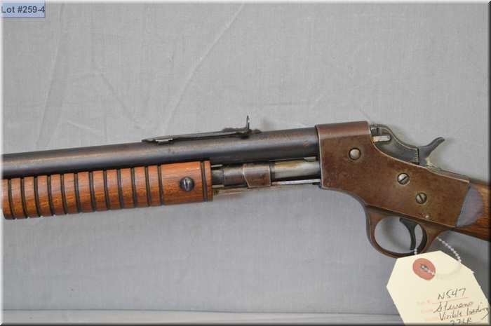 Stevens Model Visible Loading .22 LR cal pump action Rifle w/22" bbl [ fading blue finish turning brown, butt stock check chipped at toe along with butt plate, broken screw missing on receiver, slight crack to forewood ] Ser # N547