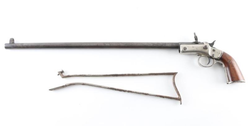 SN 16327. Rifle. Single-Shot. "Tip-Up" (1896-1916) 18" octagonal to round barrel. Hooded Post bead front sights. Rear adjustable flip sight. Walnut grips Brass nickel-plated frame. Nickel-plated shoulder stock has matching serial #. Bore is appears dirty/slight pitting, but rifling present. Blued barrel has mostly turned a gray plum color, about 20%. Action is smooth/tight. Nickel plated frame is good with minor scratches/dings, and some flaking to the edges. Grips are good. Shoulder stock is poor, with rust/pitting. NRA condition-Good. C&R Firearm.