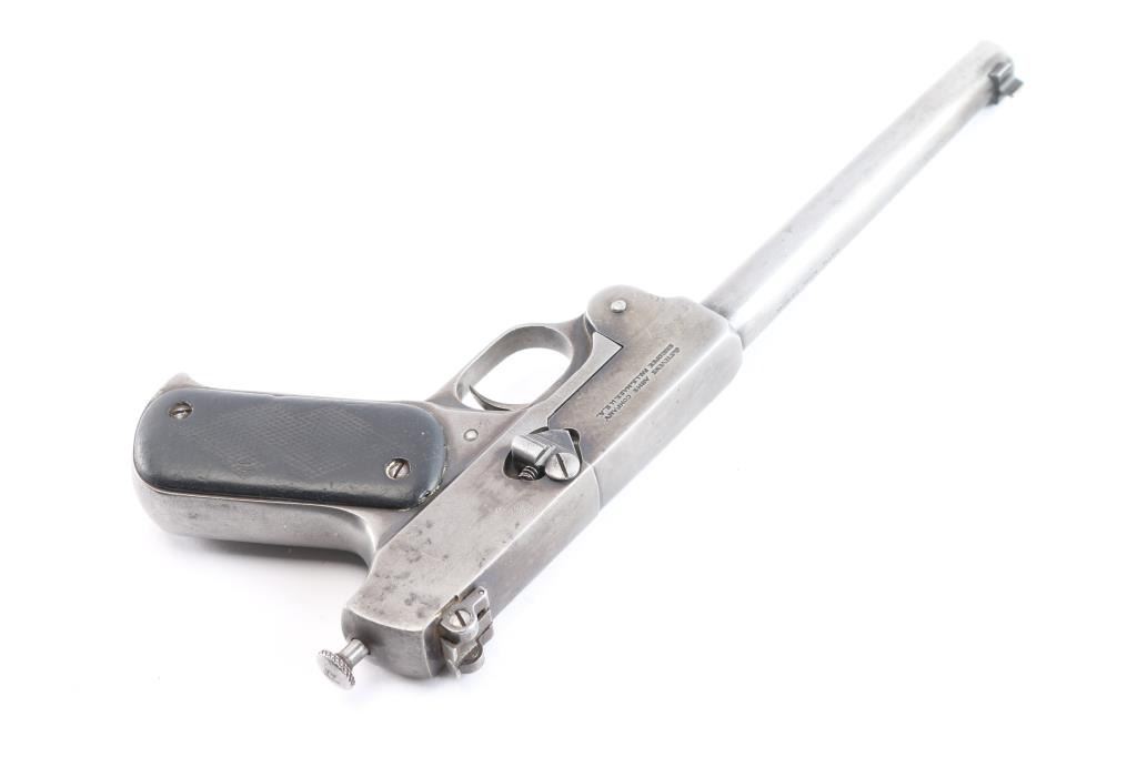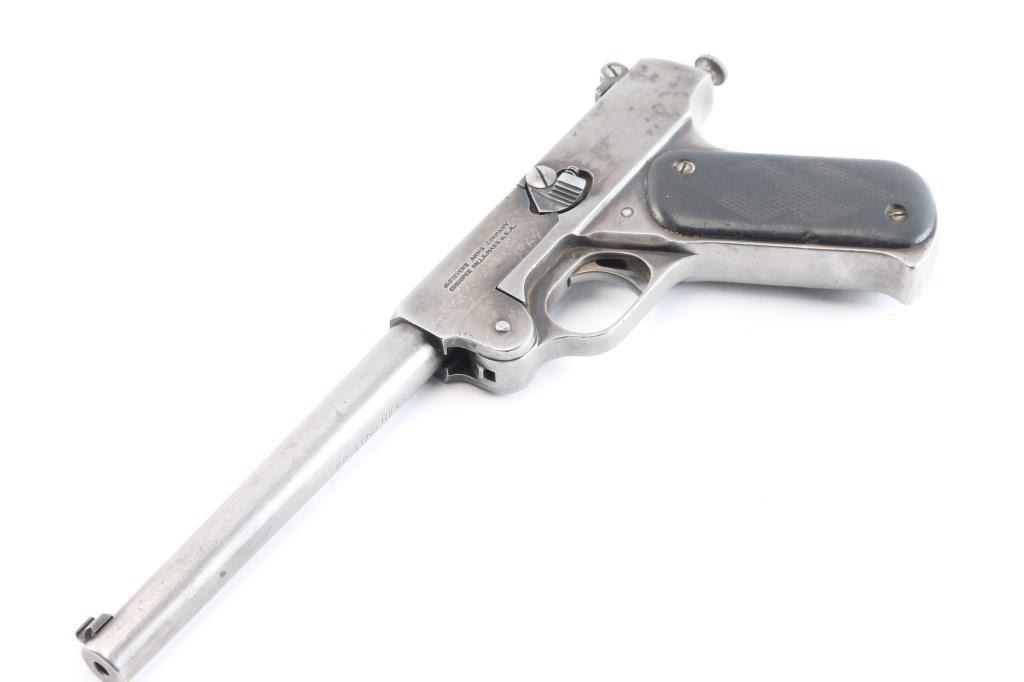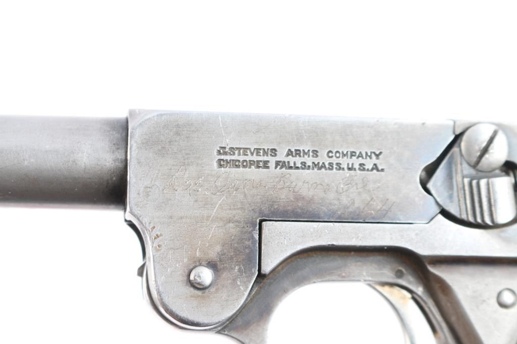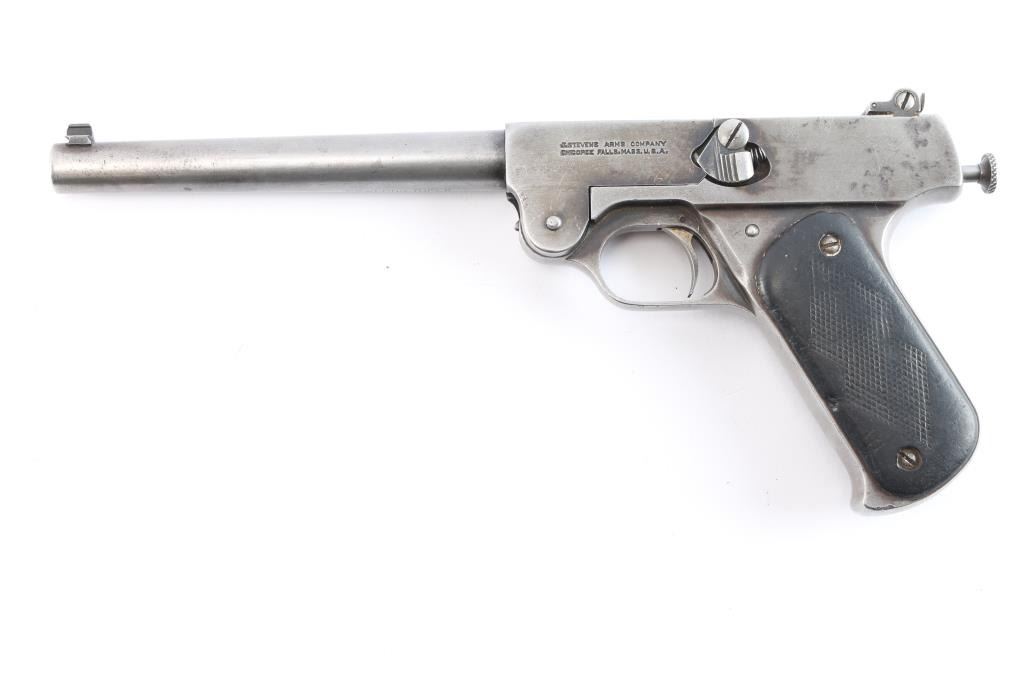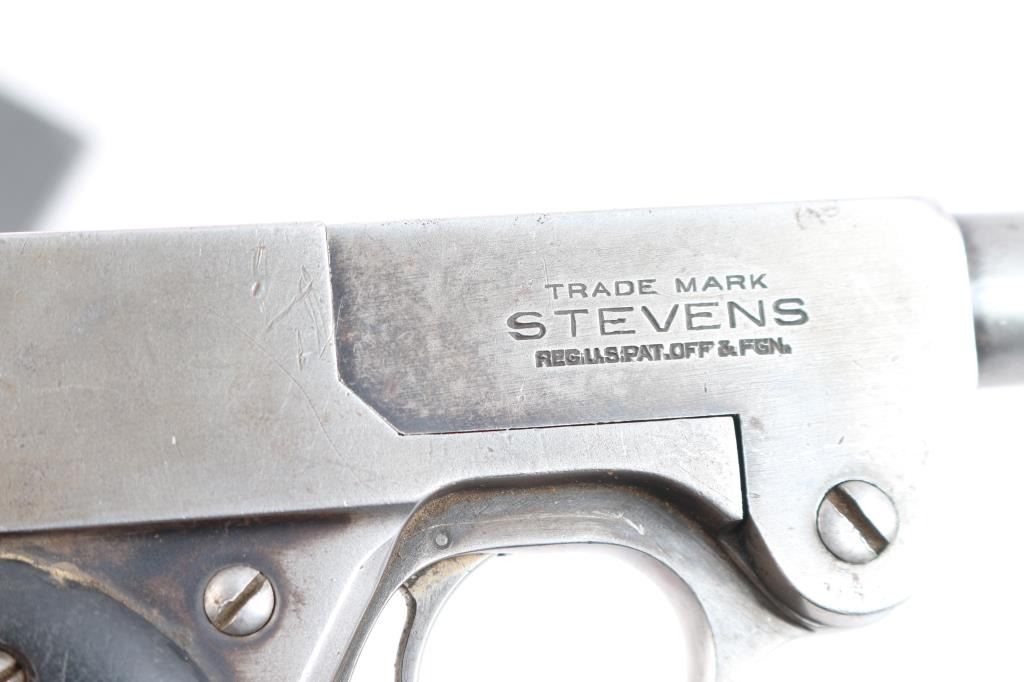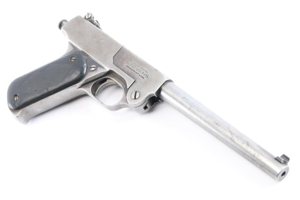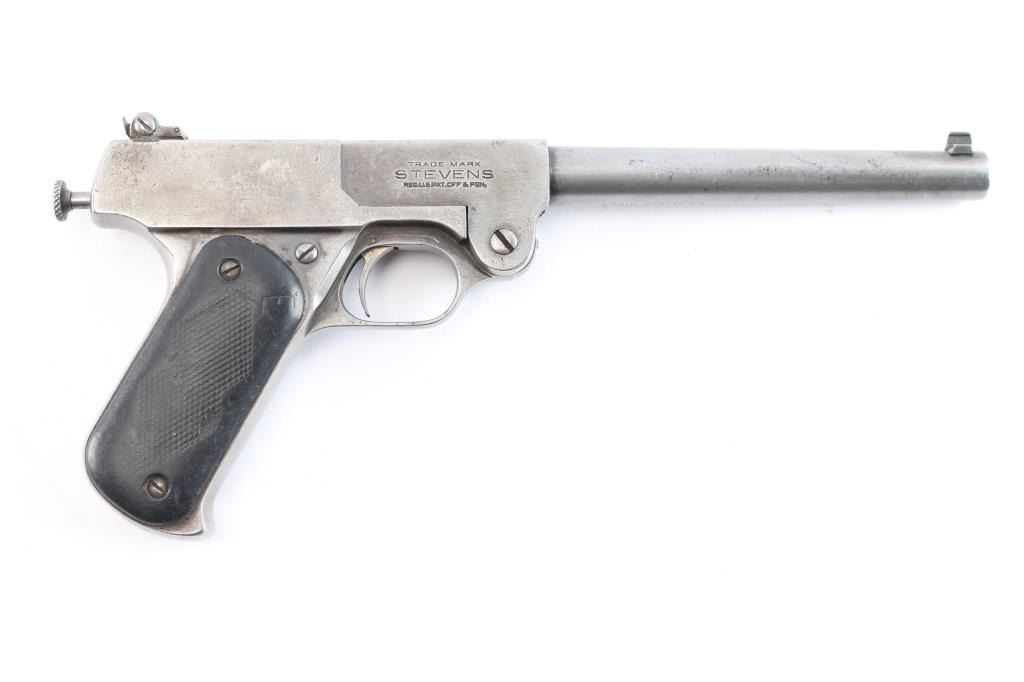 Stevens Model 10 22 long rifle caliber single shot pistol with 8" barrel, made 1919-1933, serial #2679 and slightly more than 7100 made. Single shot with manual cocking knots at the rear. Traces of original blue drifting to gray brown. The hard rubber grips show wear. Locks up tight with bright and very good bore. This model has seen a recent increase in interest in Arizona to equip with a legal sound suppression device.