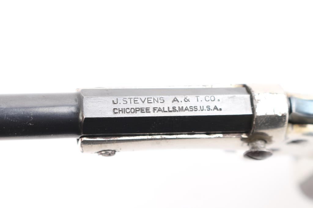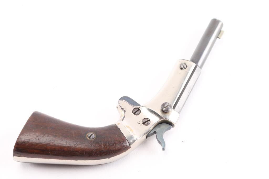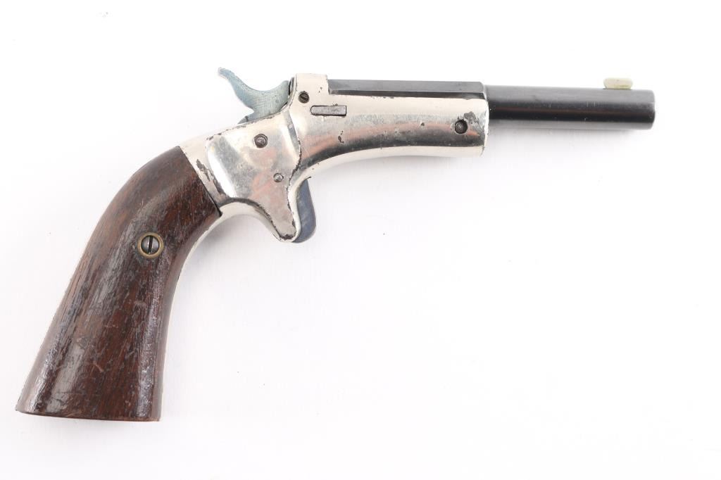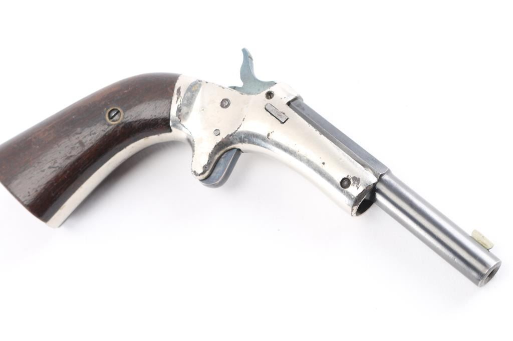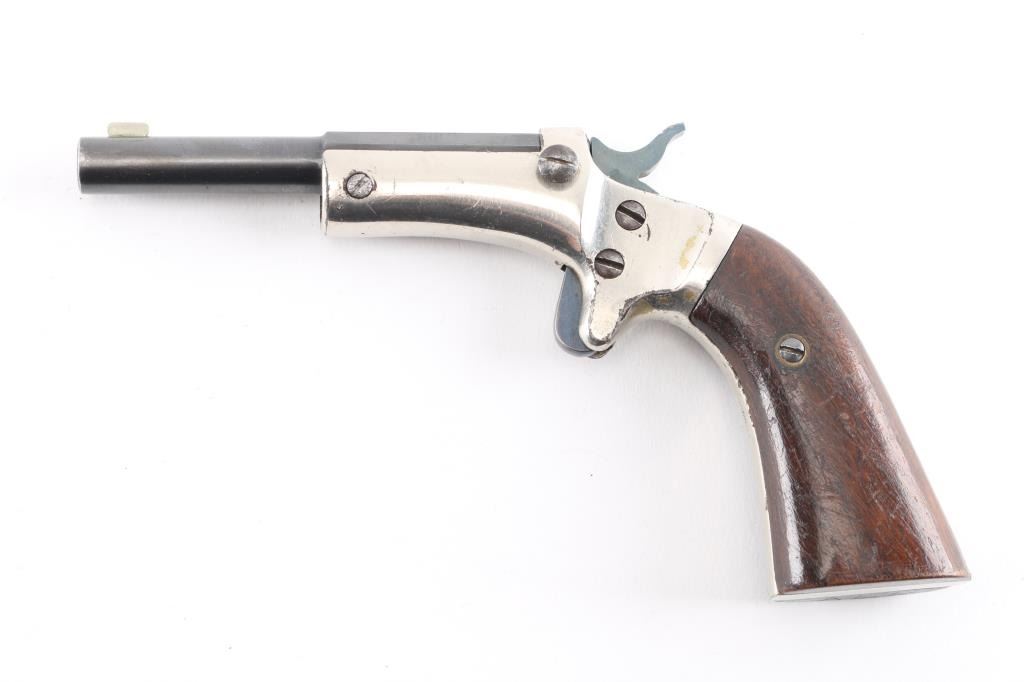 Single action, tip up target pistol with 3 3/8"octagonal to round barrel, elongated grip, small frame, most of barrel blue remains with minor edge wear, two line barrel address is crisp/clear, original nickel remains on brass frame is about 90% with minor flaking, loss to the edges, grips are good/sound with many minor scratches, "ALK" is carved on the bottom of the left grip, good action. Bore is very good/bright. No rear sight. Manufacture 1903-1916. . Matching serial numbers on barrel and grip frame. NRA Condition-Near Very Good. C&R Firearm.