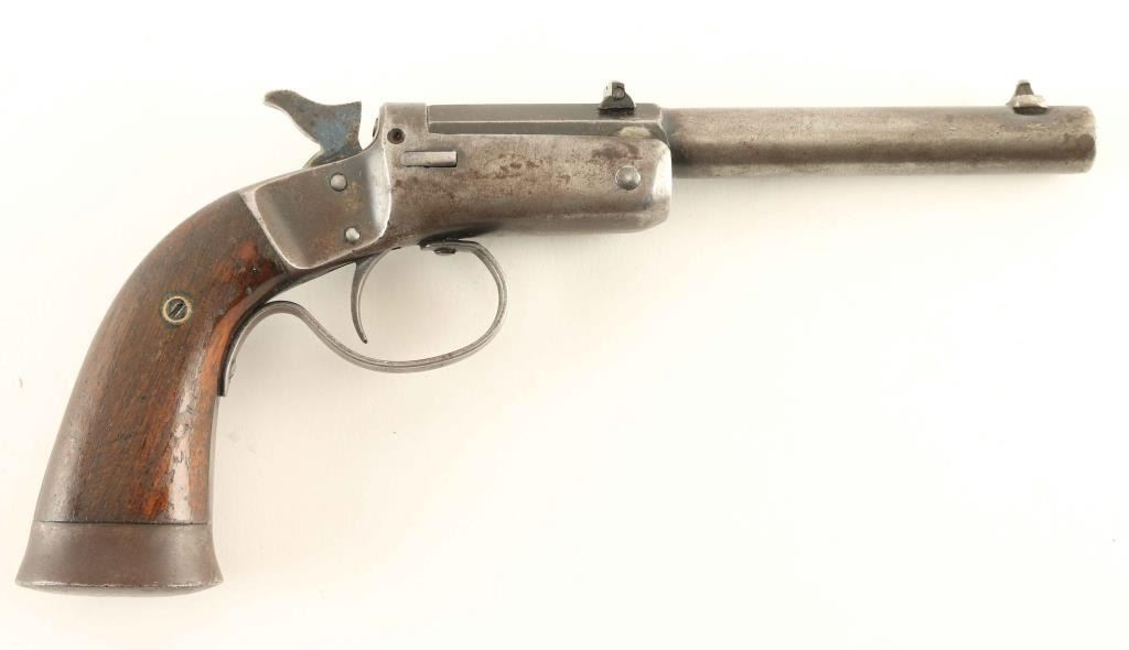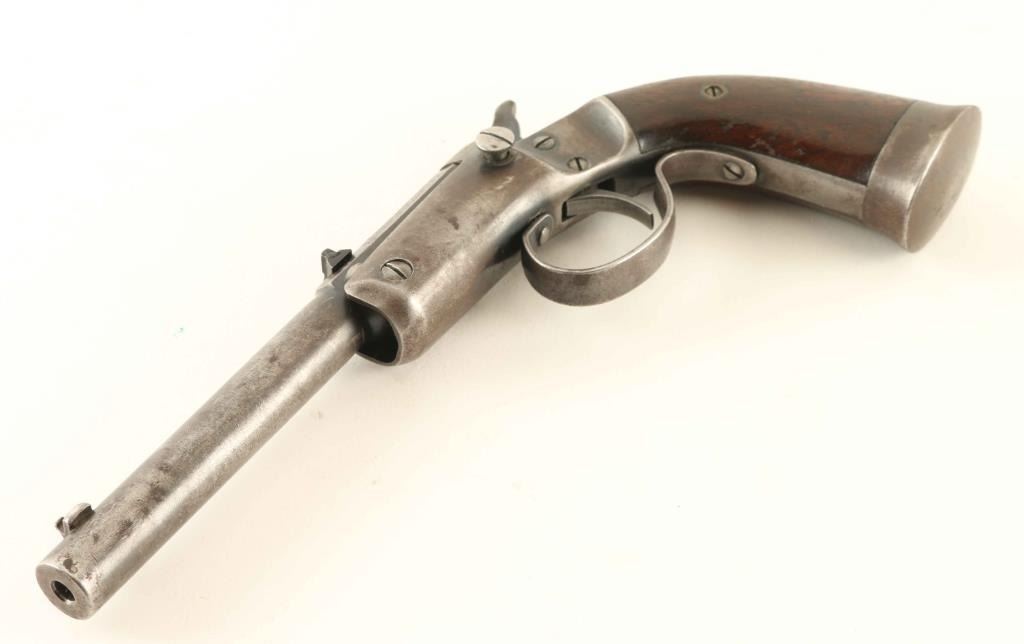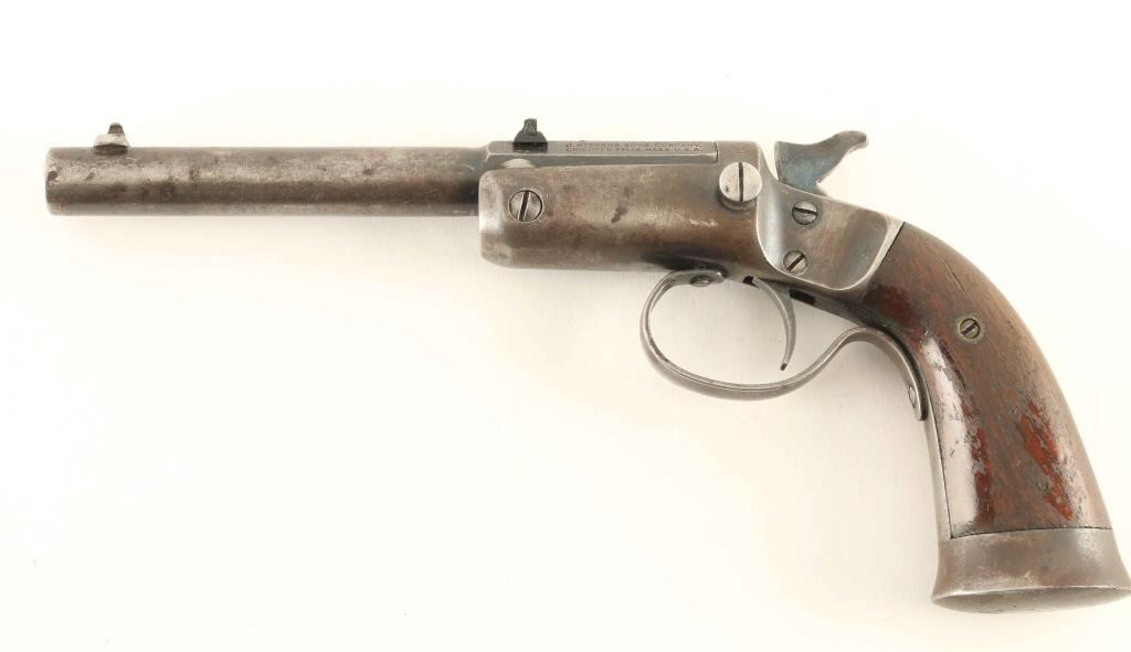 Vintage single shot rimfire pistol manufactured circa 1929-1942. Features a blued finish, 6" part octagon tip-up barrel, automatic extractor, dovetailed blade front sight with bead top, windage adjustable rear sight, smooth trigger, stamped sheet metal triggerguard, serrated hammer spur, iron frame with weighted & flared butt cap, and two-piece smooth walnut grips. Serial numbers match on the barrel, frame & grips. Pistol exhibits approximately original 10% bluing with finish retained in the protected areas while the balance of the metal surfaces display an aged grey/brown patina. Action is sound, the bore is excellent, markings are crisp and the wood stocks are near fine with flaking varnish. Condition is Good. ***C&R Firearm***