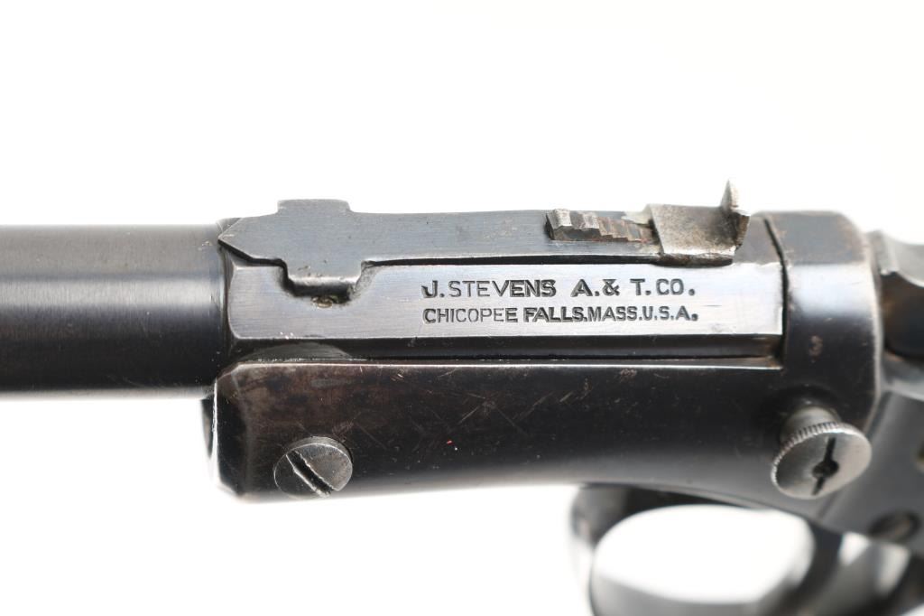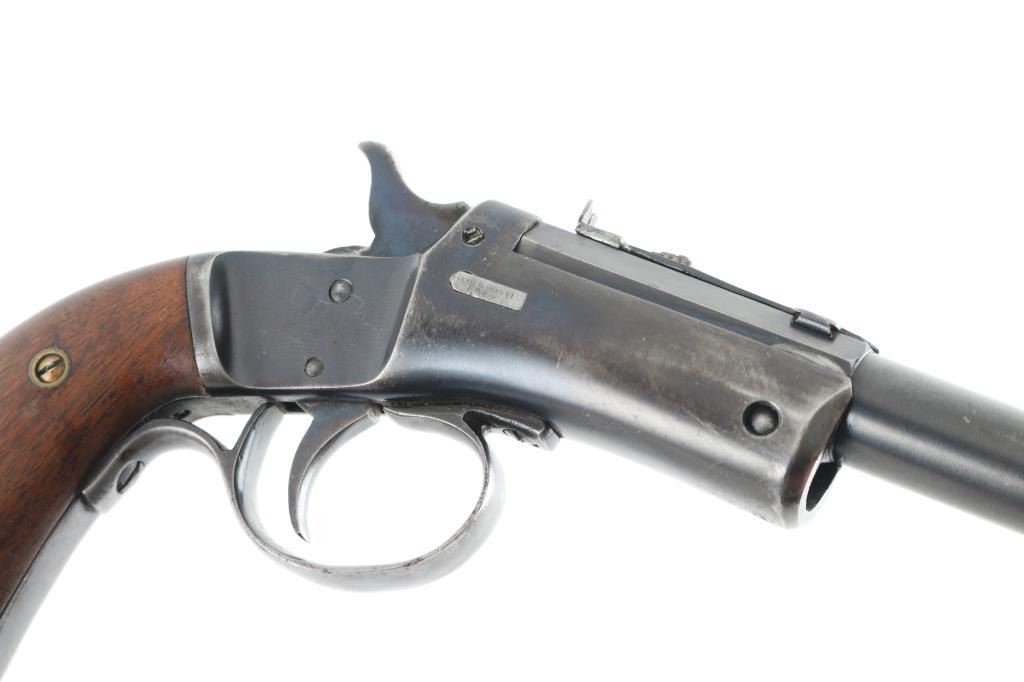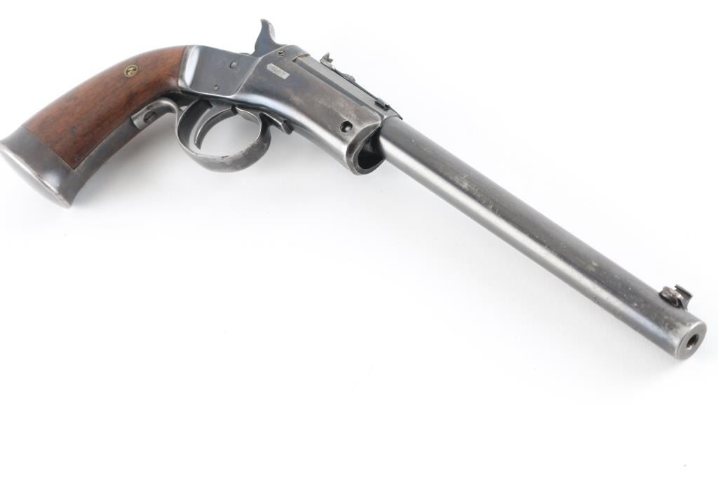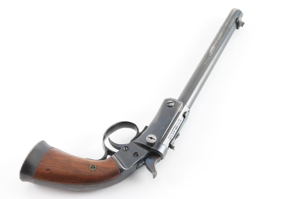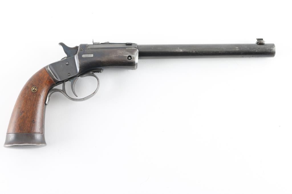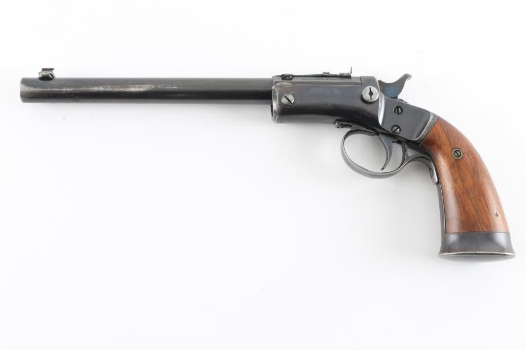 Vintage American made single shot rimfire pistol manufactured circa 1907-1916. Features a blued 8" part octagon/part round tip-up barrel, automatic extractor, dovetailed blade front sight, rear sporting sight, smooth trigger, cast metal triggerguard, knurled hammer spur, blued frame with weighted & flared butt cap, and two-piece smooth walnut grips. Matching serial numbers are found on the barrel & frame, as well as in pencil under both grip panels. Bore is good to very good, some slight darkness in grooves, strong solid rifling. Retains 80% coverage of blue, some fading of color on barrel and grip straps down to butt cap, original brighter blue retained on back half of barrel & on sides of hammer, darker color on upper frame, showing scratches & edge losses, dents & dings on bottom of barrel near muzzle. Grips are very good, showing small dents. Action is smooth, light trigger let-off. Condition is NRA Very Good+ *** C&R Firearm ***
