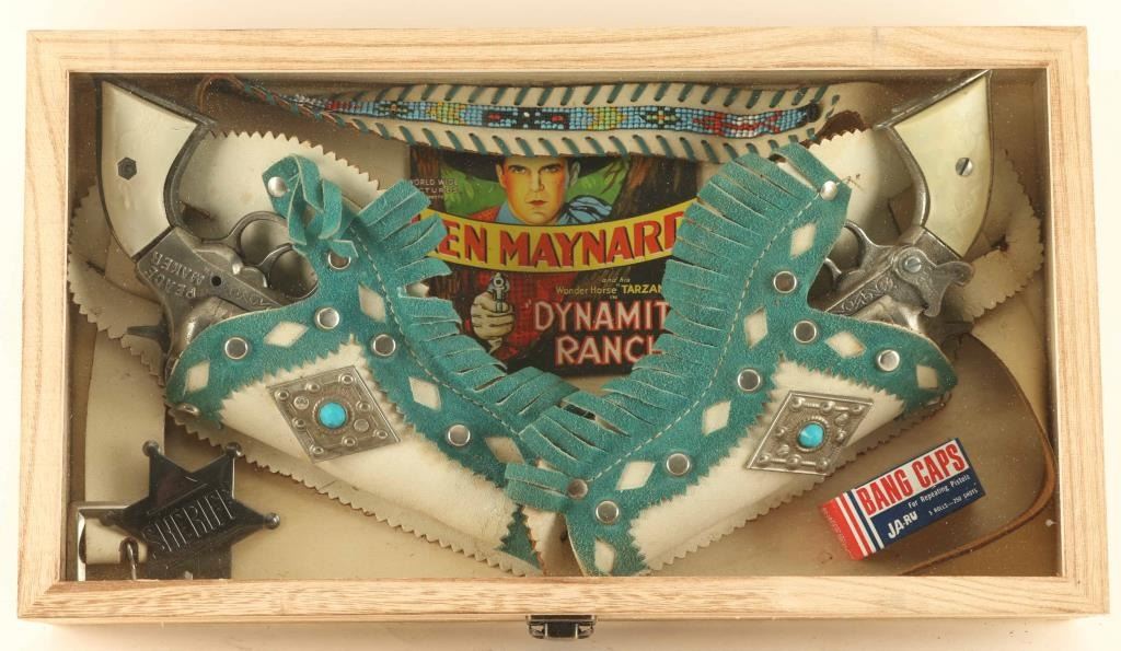 cast iron guns with spotted two-tone turquoise and white rig with fringe in wood shadow box with mounted badge and box and Maynard label.