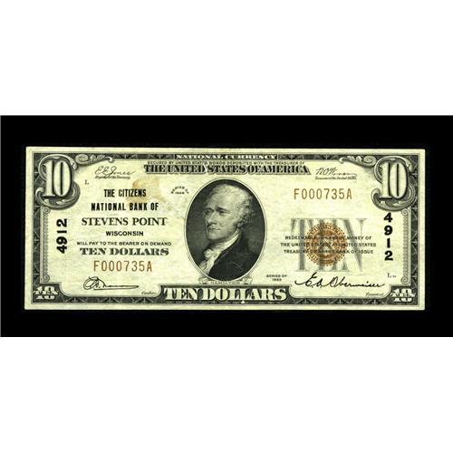 <B>Stevens Point, WI</B></I> - $10 1929 Ty. 1 <B>The Citizens NB</B></I> Ch. # 4912<BR>This <B>Very Fine</B></I> $10 is from an avidly collected community. A spot is found in the area of the bank title.<BR><BR><b>Shipping:</b> Coin/Currency (<a target="_blank" href="http://www.heritageauctions.com/common/shipping.php">view shipping information</a>)