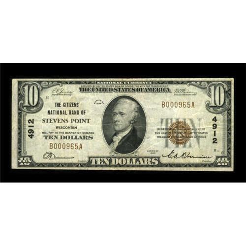 <B>Stevens Point, WI</B></I> - $10 1929 Ty. 1 <B>The Citizens NB</B></I> Ch. # 4912<BR> A nice small example from one of the most avidly collected communities in the nation. <B>Fine-Very Fine.</B></I><BR><BR><b>Shipping:</b> Coins & Currency (<a target="_blank" href="http://www.heritageauctions.com/common/shipping.php">view shipping information</a>)