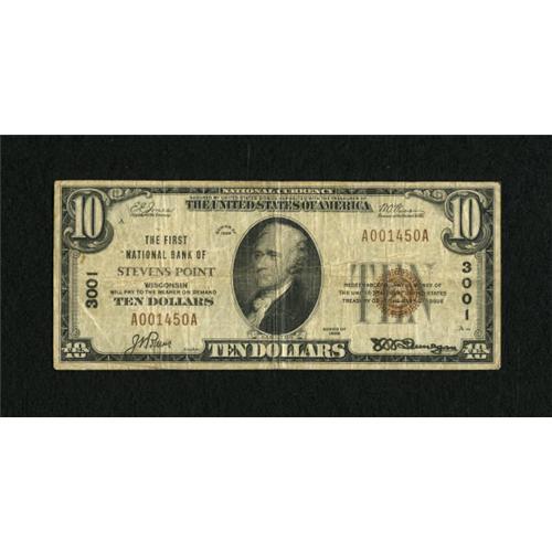<B>Stevens Point, WI</B></I> - $10 1929 Ty. 1 <B>The First NB</B></I> Ch. # 3001<BR> An average circulated note from this central Wisconsin issuer. <B>Fine+</B></I>.<BR><BR><b>Shipping:</b> Coins & Currency (<a target="_blank" href="http://www.heritageauctions.com/common/shipping.php">view shipping information</a>)