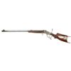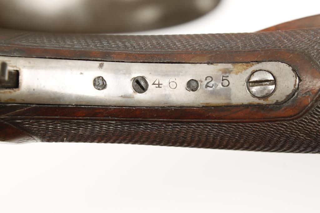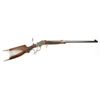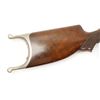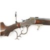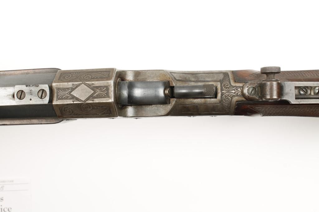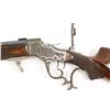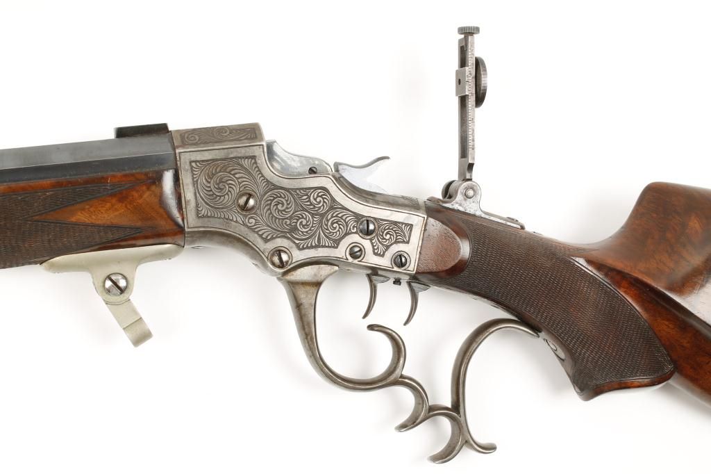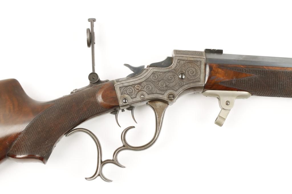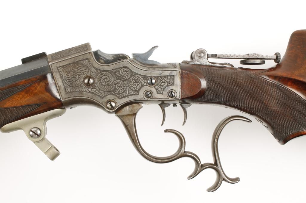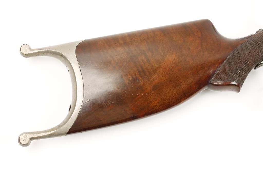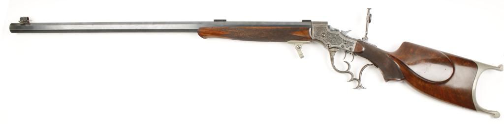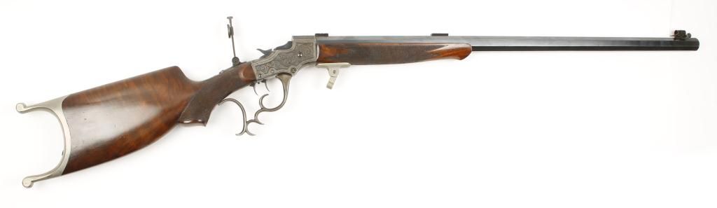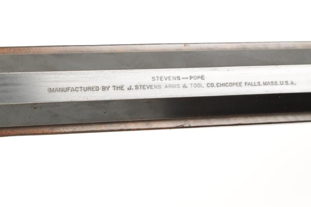 Stevens-Pope .28 -.30 caliber single shot target rifle in very good plus to near fine original condition showing a 32” heavy octagon barrel that is marked Stevens – Pope, manufactured by the J. Stevens Arm and ToolCo., Chicopee Falls, Mass. USA. The barrel measures approximately 1 1/10” across the flats of muzzle and the muzzle is drilled for a bullet starter. The gun is numbered 4625 on the inside tang and shows double settriggers with fancy enlarged Pope type lever. The forend is mounted with a base for a palm rest which is not included and the tang is mounted with a veneer type sight. The stocks are fine quality with nice burled wood grainand show original checkering with a perch belly type target stock, rollover cheek piece and nickel plated butt plate. The barrel is mounted with later scoped blocks and the front sight is a target type in the originaldovetail. The action is good and the bore is fine to near excellent. The frame is scrolled engraved in Stevens factory style. The frame retains 30% to 50% case hardening drifting to silver with some light colors. The barrel