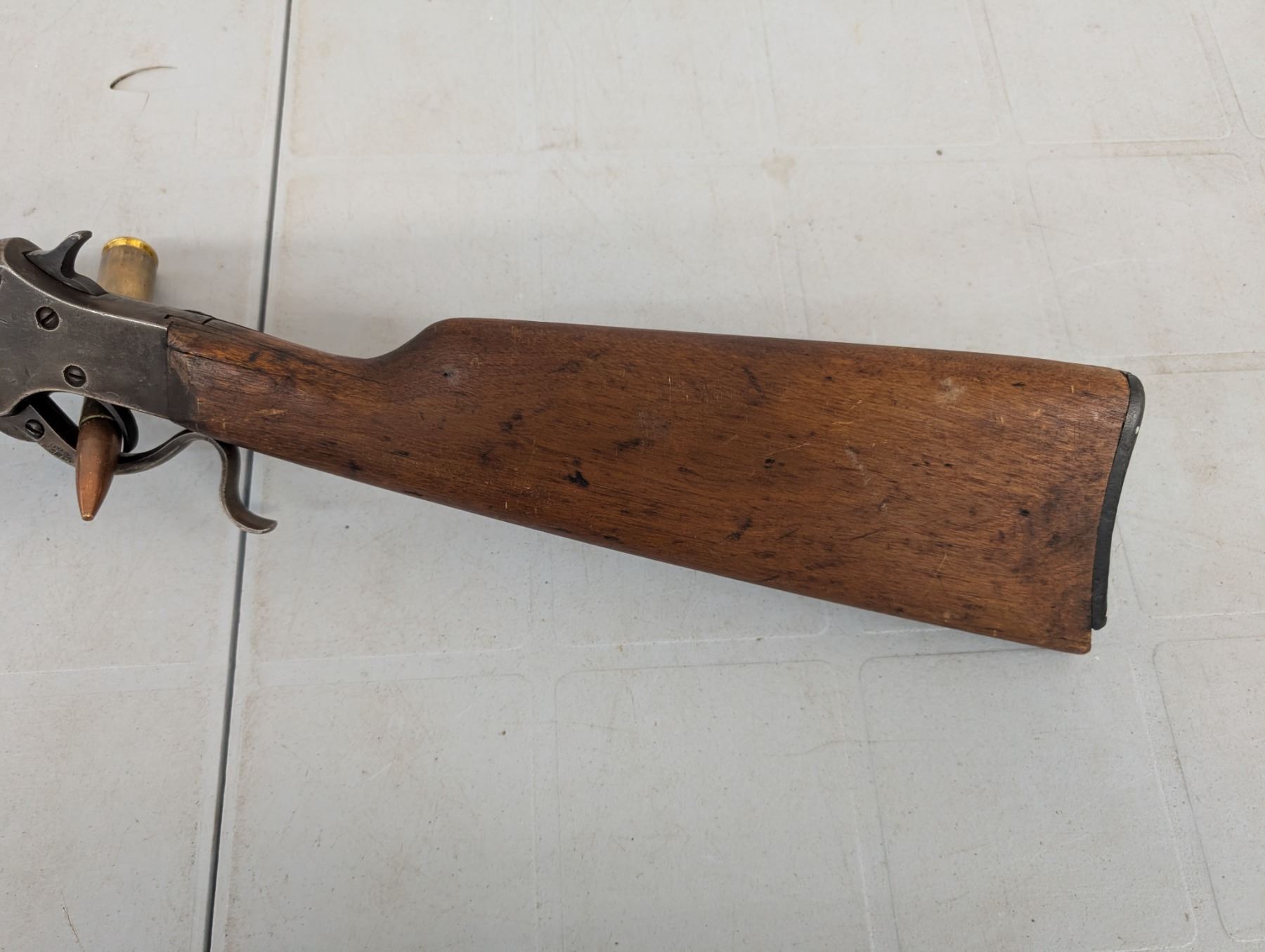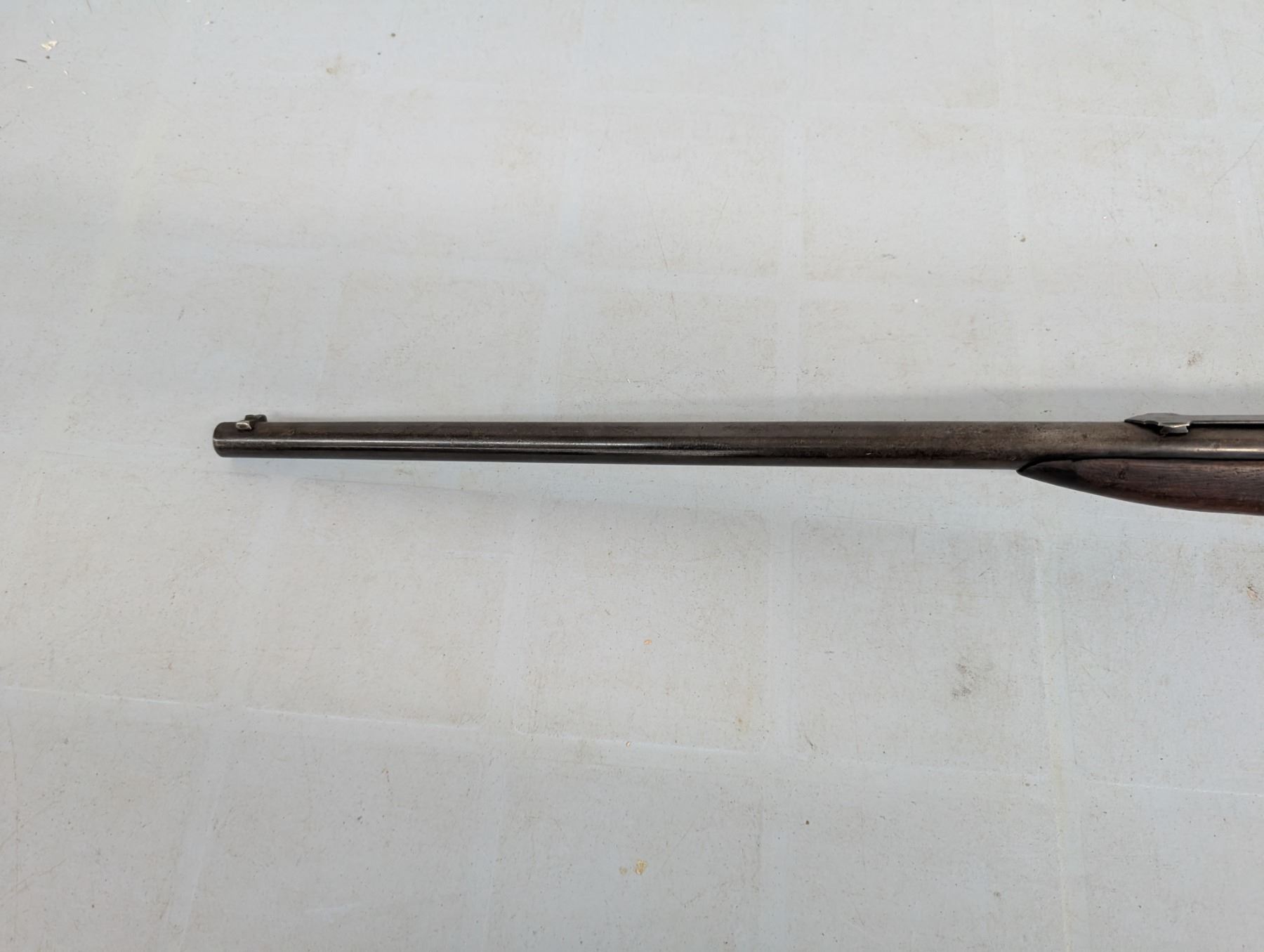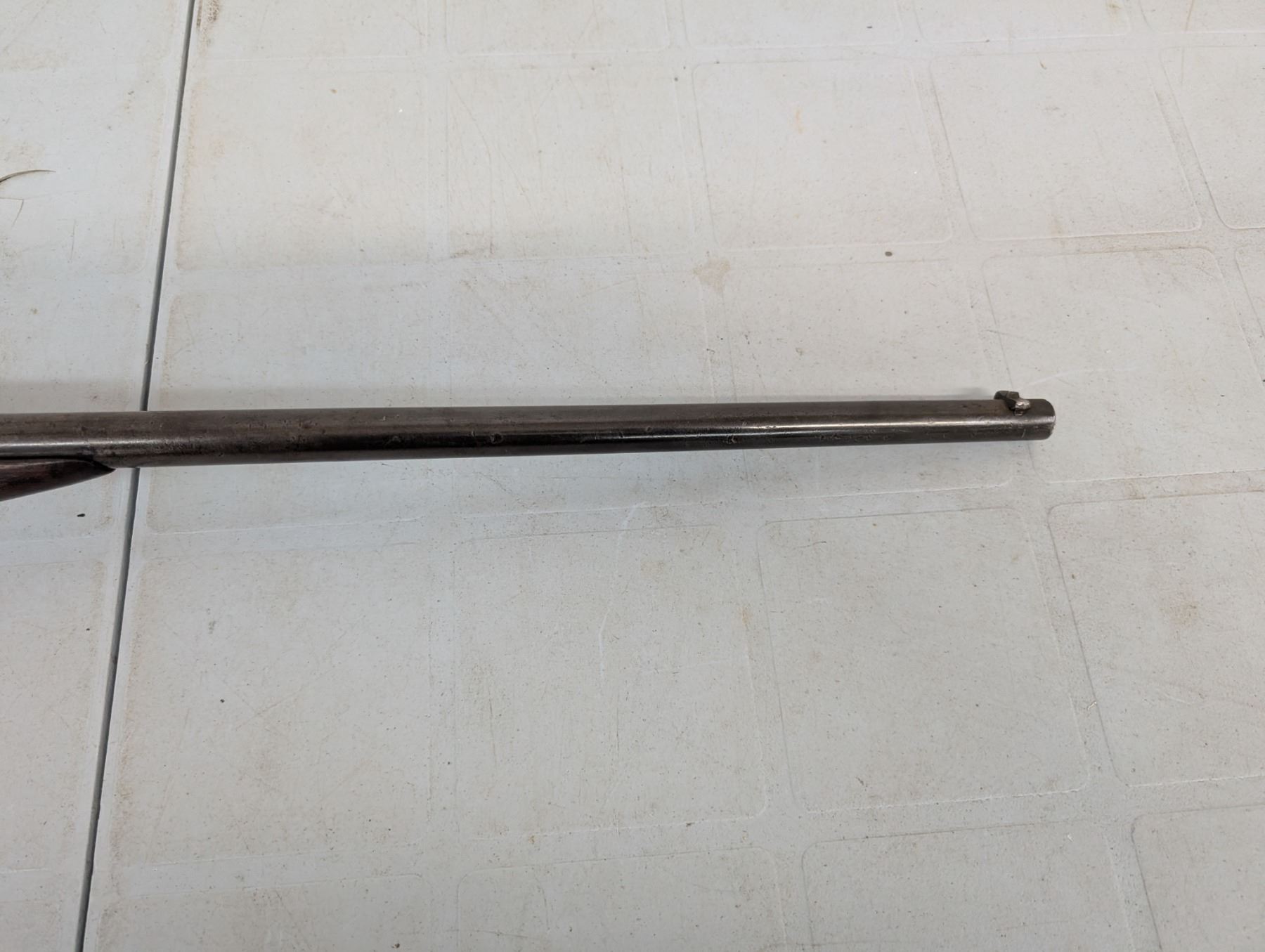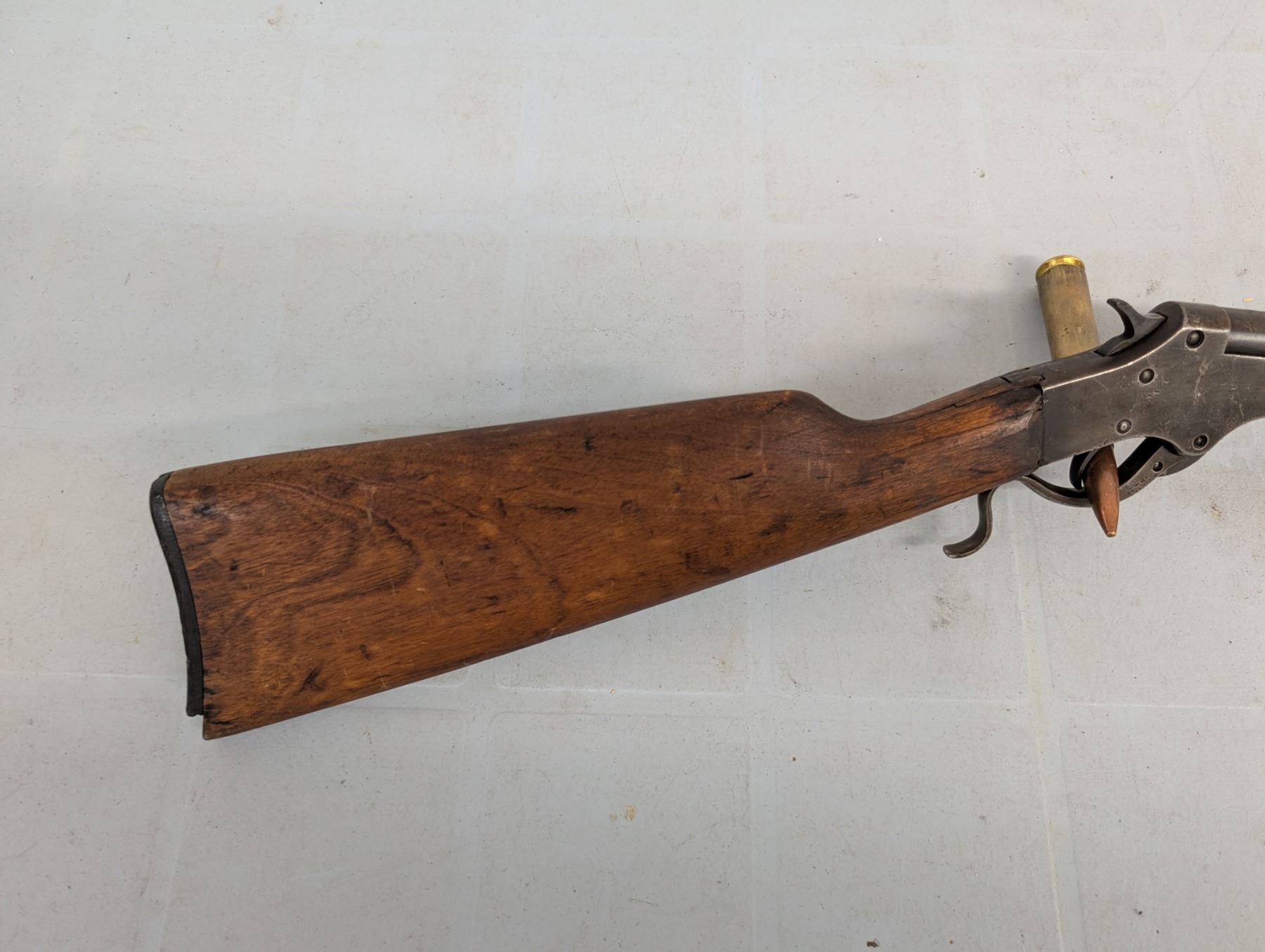 break action. Bore is dark and patchy. Retains some original finish in protected areas. Stock has cracks and repairs. Butt plate missing a chunk at toe.