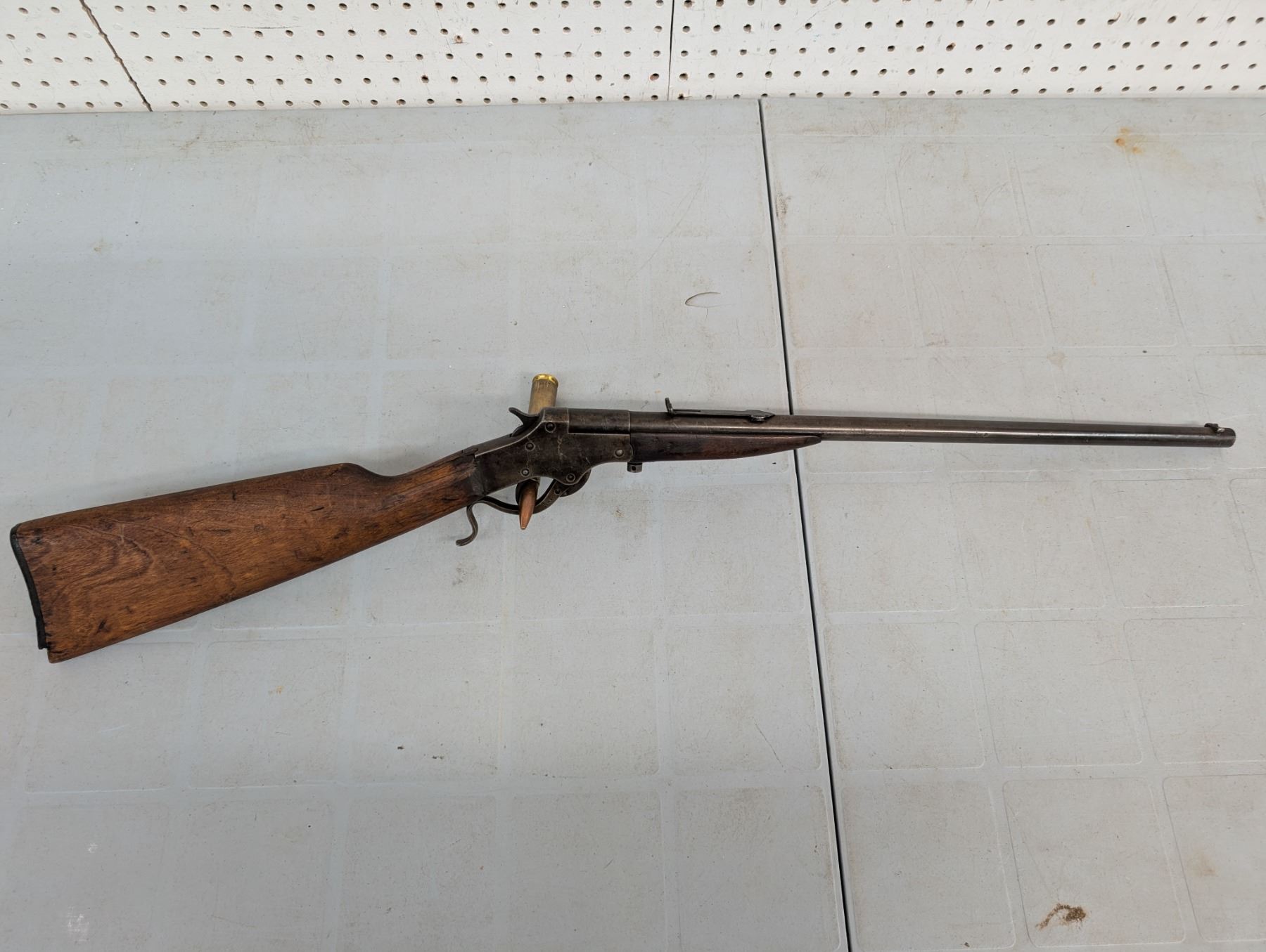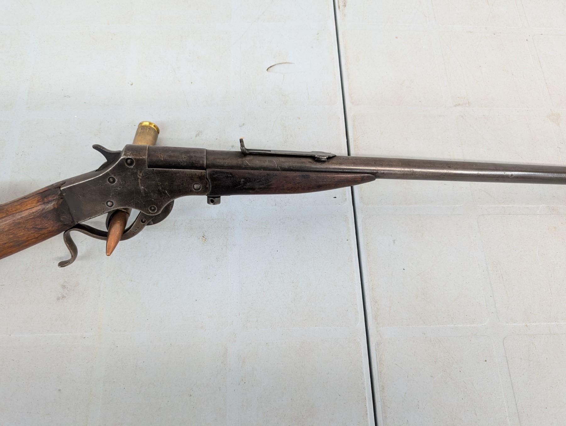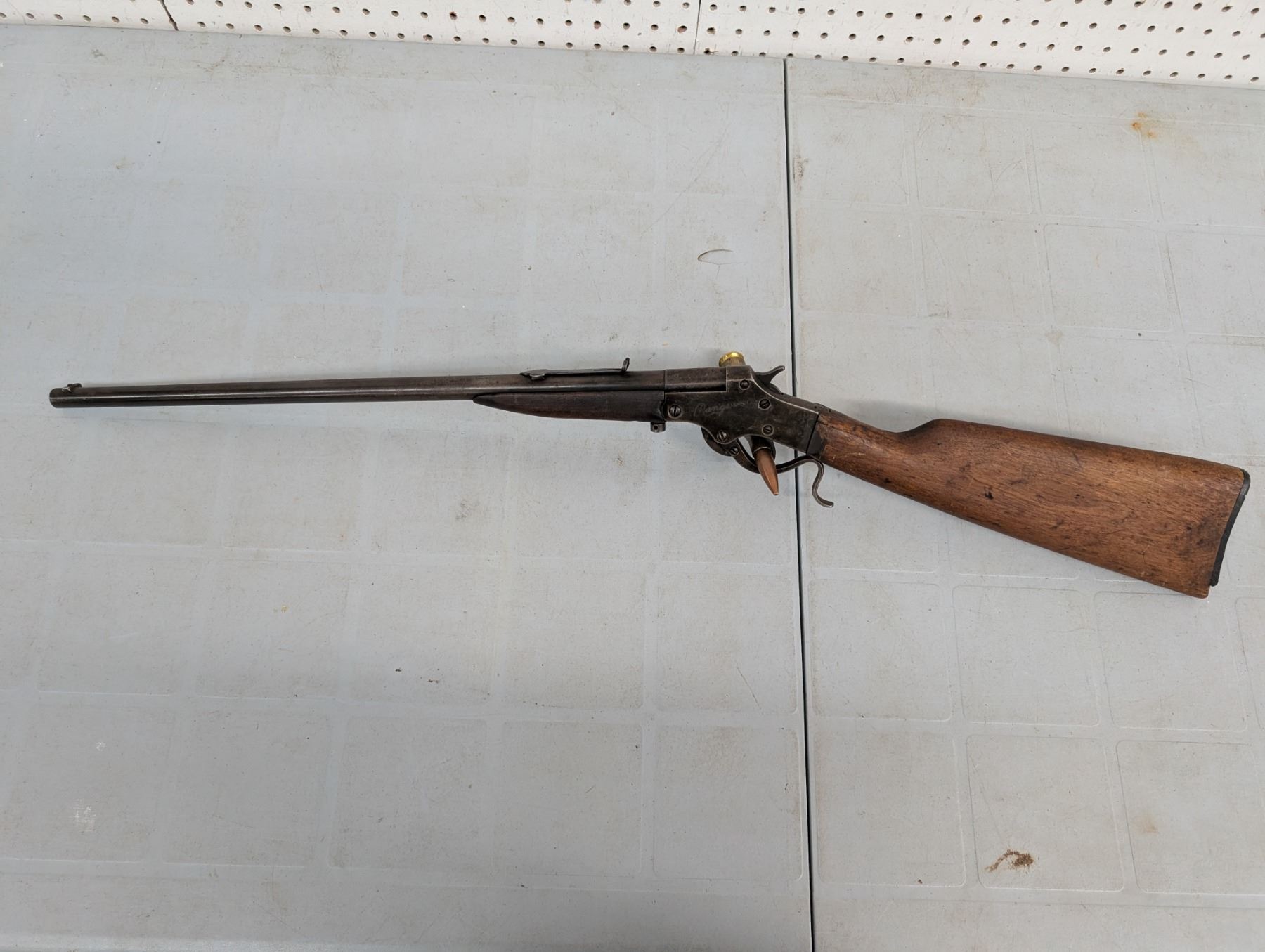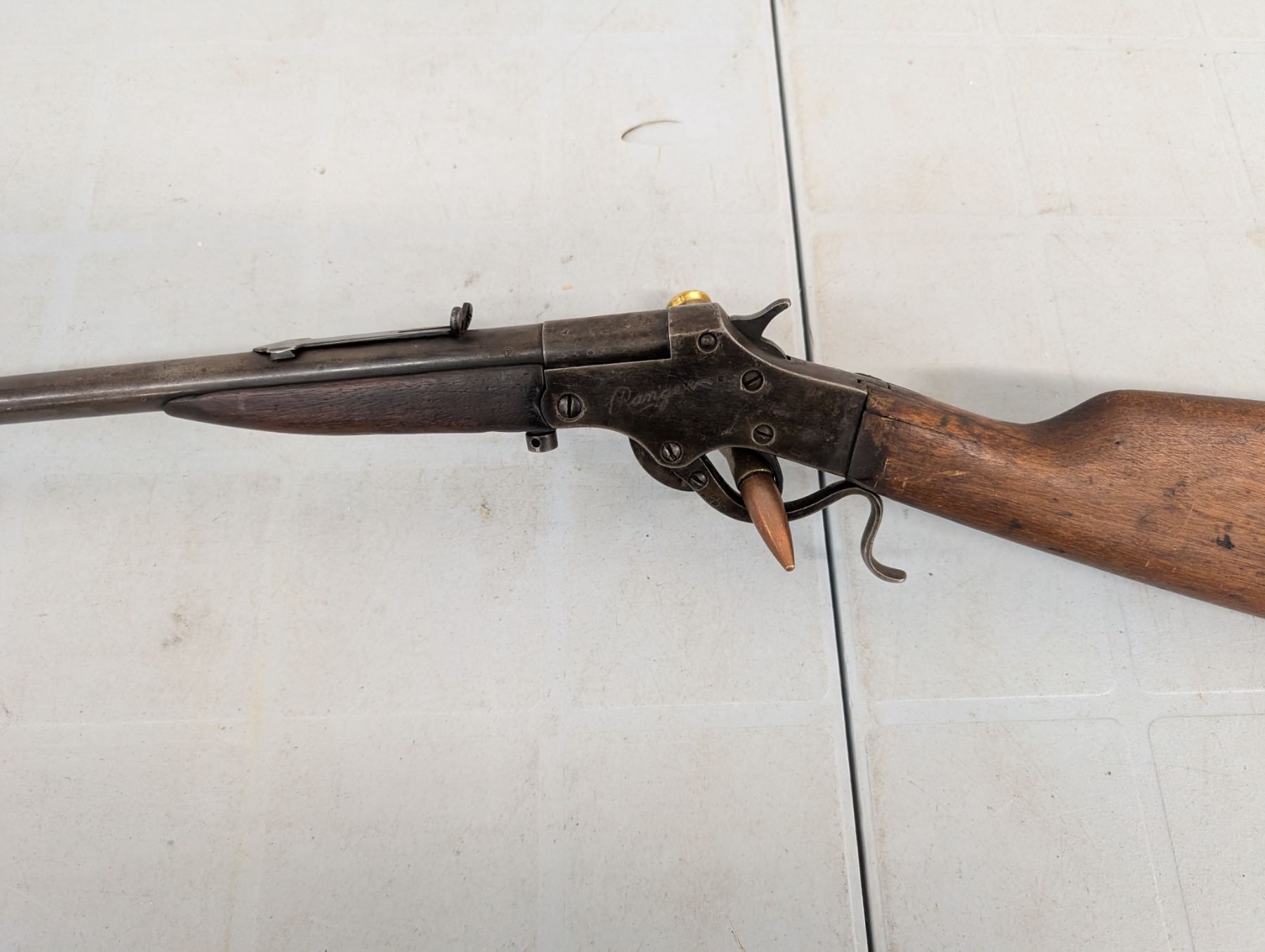 break action. Bore is dark and patchy. Retains some original finish in protected areas. Stock has cracks and repairs. Butt plate missing a chunk at toe.