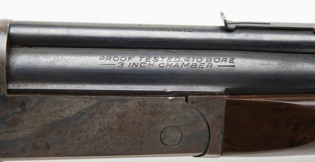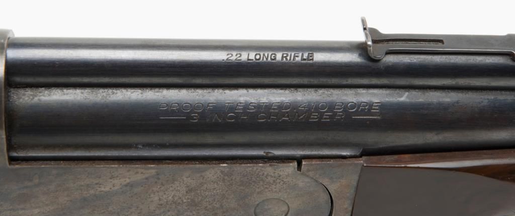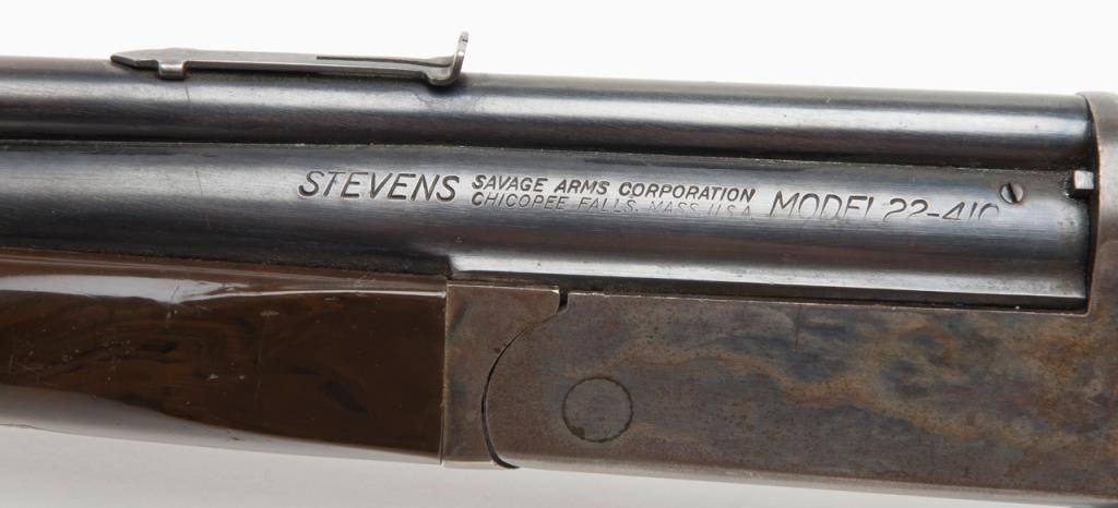 Stevens/Savage Combo rifle, .22LR/410 gauge, 24” barrels, blue and case hardened finish, mottled brown plastic stocks, #NVSN in overall very good condition showing considerable original finish, very good action and markings, bores should cleanto very good; very good stocks. (C&R/PPT). Est.: $150-$300.