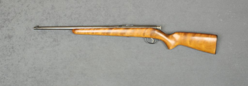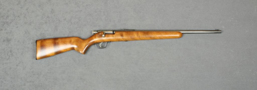 Stevens/Savage Model 15-A bolt-action rifle, .22 short, long or long rifle cal., 21” round barrel, blue finish, wood stock, #NVSN. This gun is in overall very good condition showing traces of original finish inprotected areas and the balance of metal surfaces gone to a grey patina, very good bore, action and markings; wood is very good with some scattered storage nicks and mars. Est.: $50-$100.