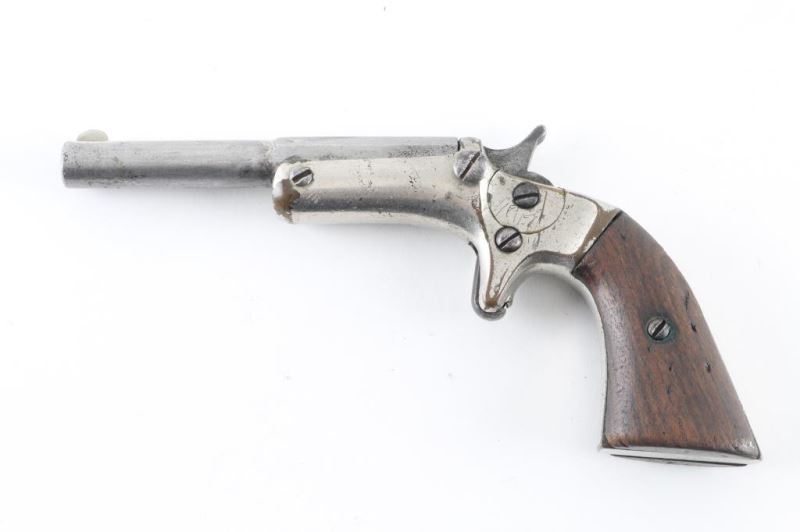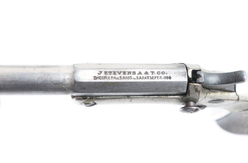 SN: 8615. Pistol. Single-Shot. "Tip-Up". Stevens Model 41. 3.5" octagonal to round barrel. No side-plate. Stevens markings on flat of barrel. Nickel plated brass frame. Smooth walnut grips. Barrel & hammer lock up tight. Bore is slightly pitted. Frame and barrel have minor scratches/dings, and some pin-prick pitting. There is some handling loss to the frame. Note* Firing pin on the hammer is broken. Hammer does not cock. NRA Condition-Poor-Broken firing pin. Does not cock. Antique Firearm.