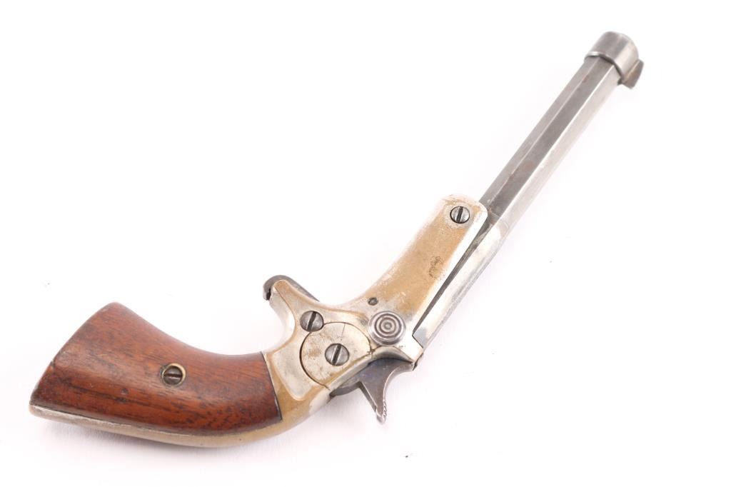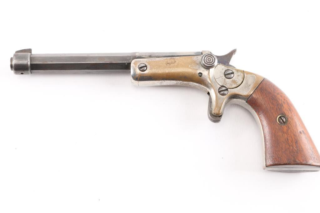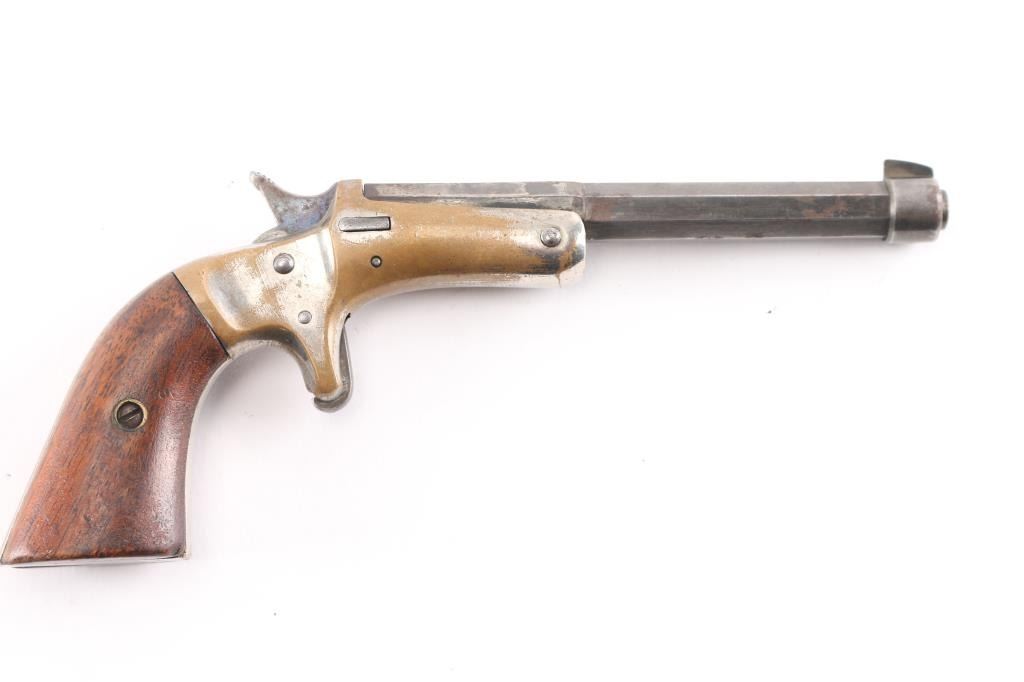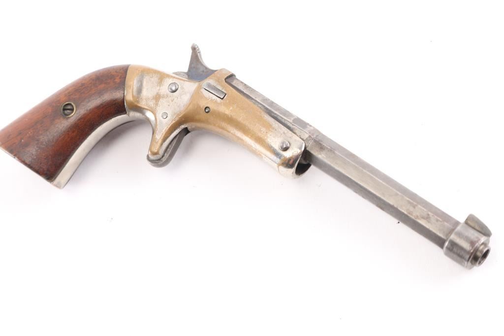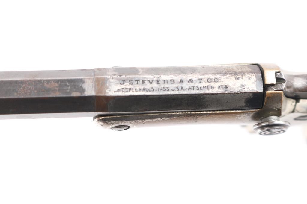 Sn: 16030. 4 1/4" full octagonal barrel, blade front sight on band, Stevens A&T barrel marking with Sept 6, 1864 patent date, Bullseye style barrel release, nickel plated brass frame. Bore is very good/bright, strong rifling, barrel locks up tight, two cock hammer action is sound, grips are very good. Nickel finish is about 20% with handling wear, serial number matched on the grip frame, barrel & grips. NRA Condition-Very Good. Antique Firearm.