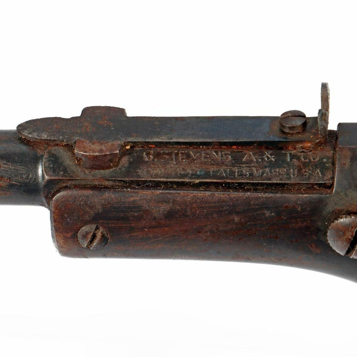 Stevens Single Shot Pistol. Made by J. Stevens A & T Co.. Engraved J. STEVENS A & T. CO. CHICOPPE FALLS MASS U.S.A.". Serial number not located. Barrel measures approximately 4in. Total 9in x 4in. Condition Report: All lots are sold as is and where is. Turner Auctions + Appraisals, LLC provides condition reports upon request to aid in your bidding decision. No statement regarding age, condition, kind, value, or quality of a lot, whether made orally at the auction or at any other time, or in writing in this catalog or elsewhere, shall be construed to be an express or implied warranty, representation, or assumption of liability. All sales are final, Turner Auctions + Appraisals, LLC does not give refunds based on condition. Turner Auctions + Appraisals, LLC does not perform any shipping or packing services. We do have a list of suggested shippers who gladly provide quotes prior to your bidding. Please visit our webpage for a list of recommended shippers.