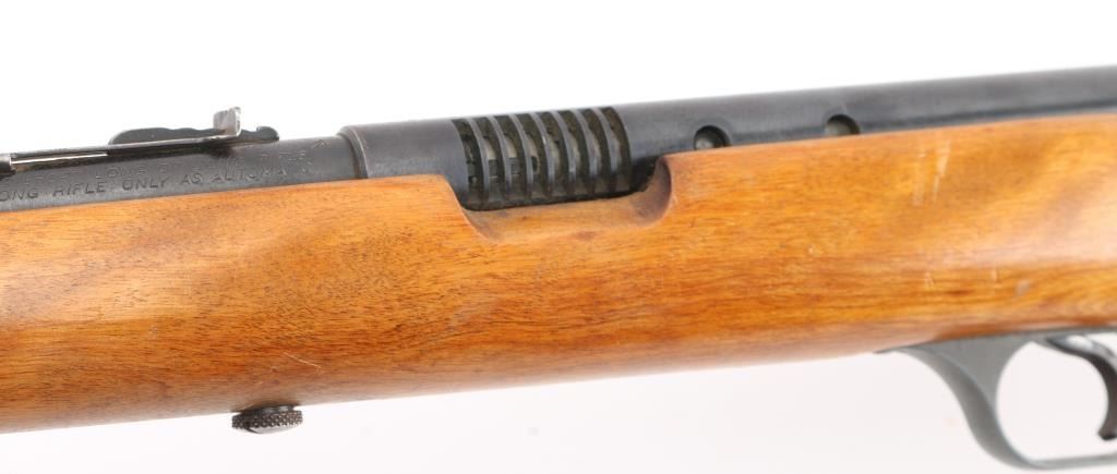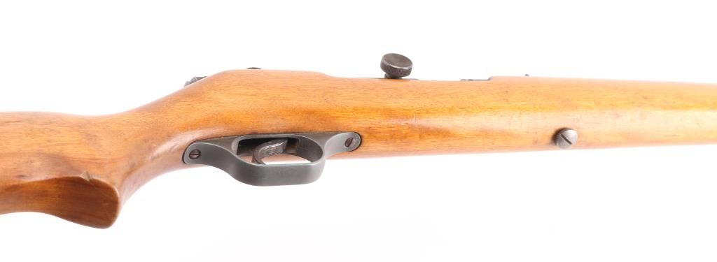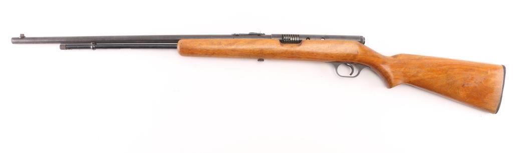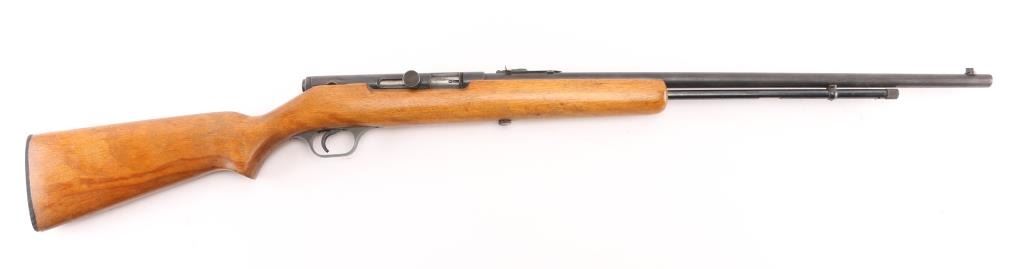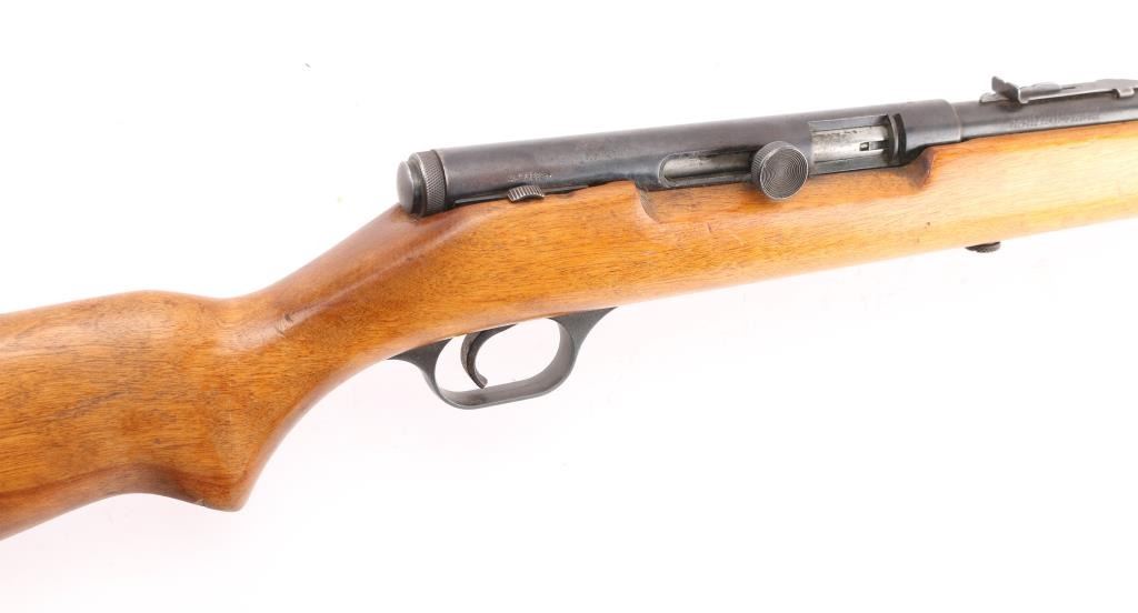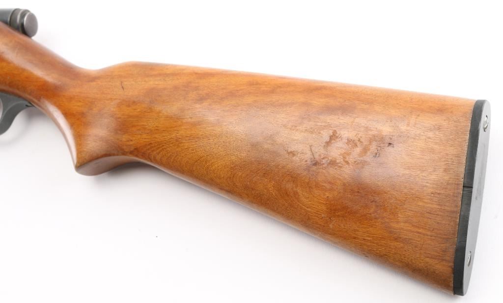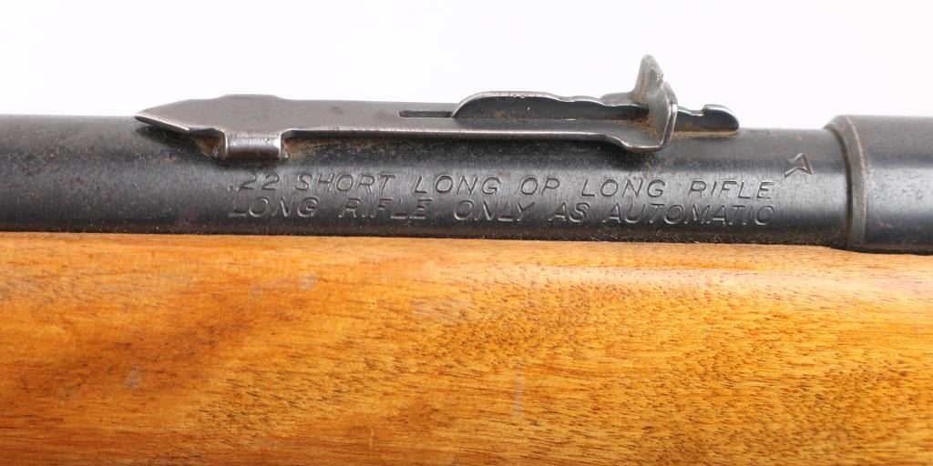 Vintage semi-automatic sporting rifle chambered in .22 SD/L/LR (.22 Long Rifle only as automatic). It has a 24" blued barrel and receiver with a dovetailed blade/bead front sight, adjustable rear sight, 3/4 length magazine tube, serrated trigger and a large cylindrical charging handle that pushes inward to lock the bolt open or closed with a thumb safety on the top right. It sits in a one piece, straight grain wood stock with a replaced black wood butt plate. Blue metal finish is all there with scattered very minor surface rust spots. The plain wood stock looks good/sound. Bore looks very good, bright. Condition is NRA Good. C&R Firearm.