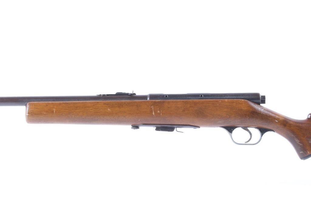 This lot features a Stevens/Springfield Model 84 C- .22 LR Rifle. The rifle features a 24" barrel, 5 shot magazine, adjustable rear sight, nickel bolt handle, and walnut stock. This rifle is in good condition, with some wear and handling marks. The receiver is drilled and tapped. This is a Curio & Relic firearms. FFL transfer or NICS background check required. No serial number.