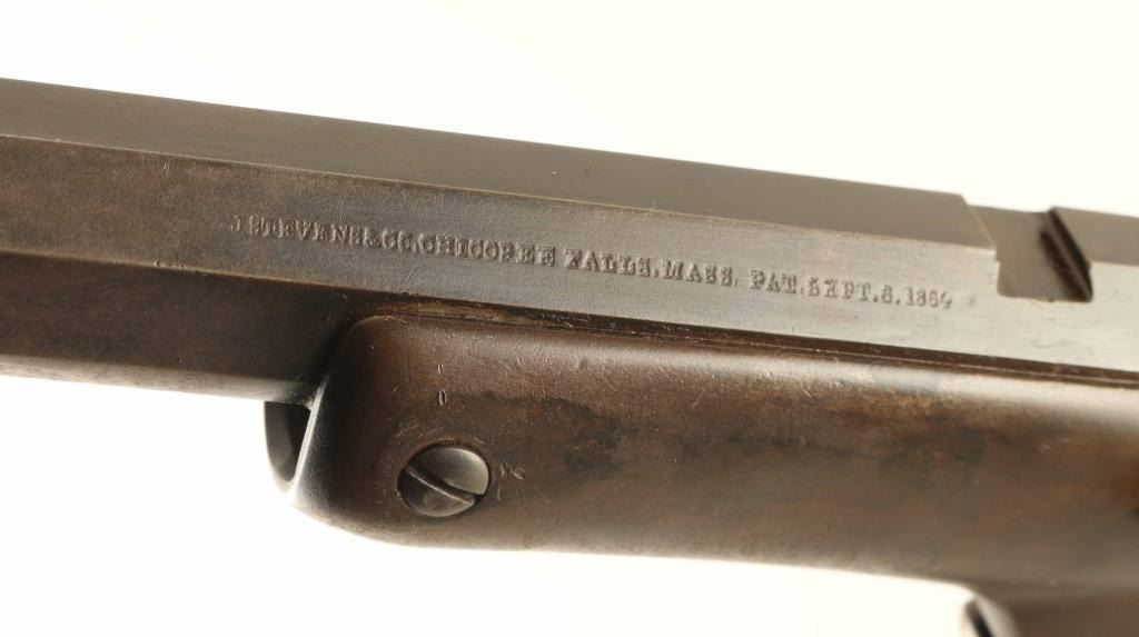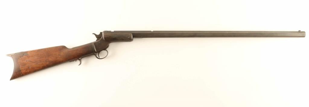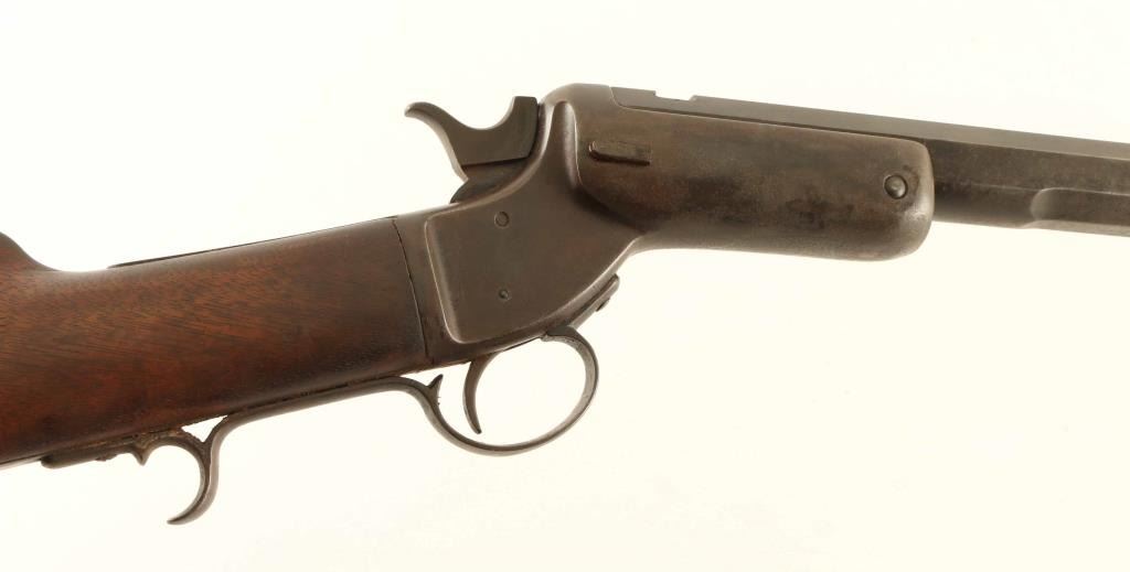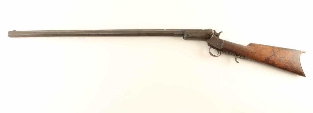 Antique break open single shot sporting rifle chambered for .32 Rim Fire, manufactured circa 1870's-1895. Features a blued heavy 28" octagon barrel, dovetailed blade front sight, two empty rear sight dovetails, nickel plated iron frame, smooth trigger, nickel plated trigger guard with finger rest, knurled hammer spur, and straight grip walnut shoulder stock with crescent metal buttplate. Matching serial numbers observed on the barrel and frame. Rifle retains only traces of it's original finish with the majority of the metal surfaces displaying an aged dark brown patina. Action is sound, the bore is dark showing some pitting, markings are good and the wood stock is good with many blemishes. Condition is NRA Good. ***Antique Firearm***