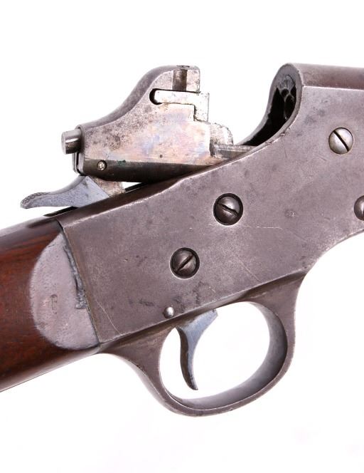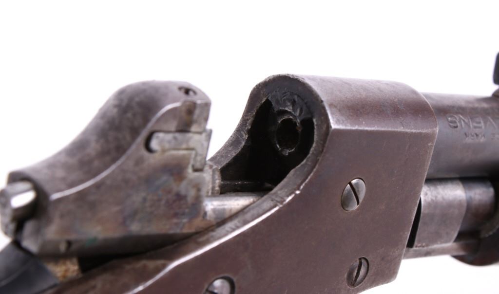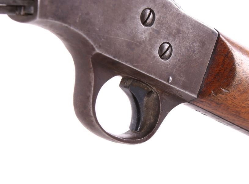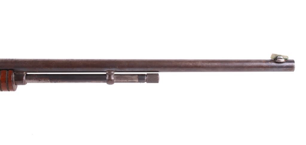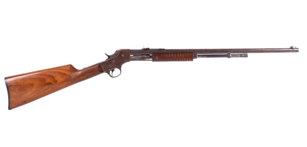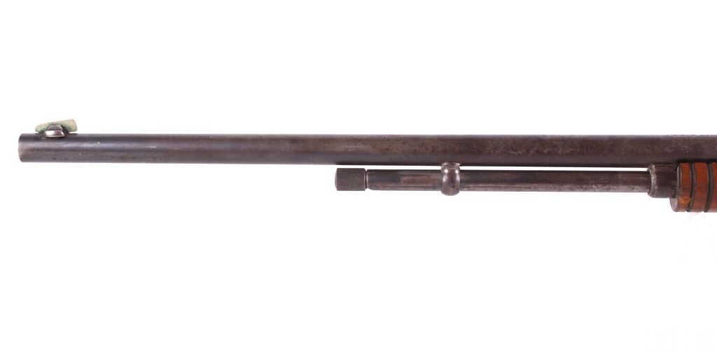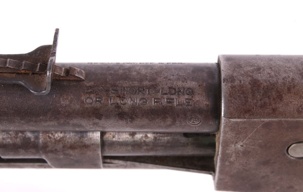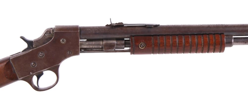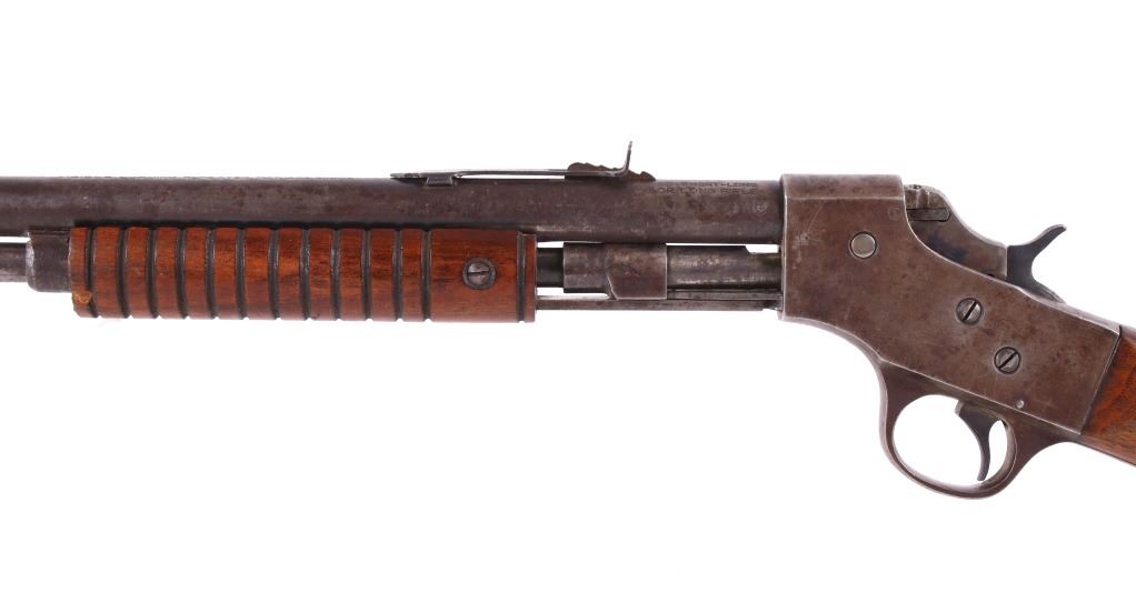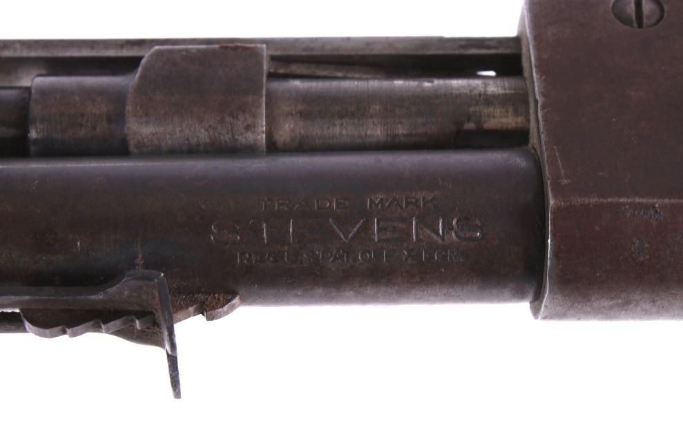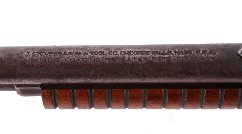 For your consideration is a Stevens Visible Loading Repeater pump action rifle chambered in the .22 Short, Long & Long Rifle caliber's. The rifle features a 22" blue'd round steel barrel and receiver with solid walnut hardwood stock. The rifle utilizes an adjustable rear sights and fixed blade front sight. The barrel is marked "J. Stevens Arms & Tool Co. Chicopee Falls, Mass. U.S.A. Visible Loading Repeater Pat. Apr. 30-07 - 22 Short, Long or Long Rifle. The Stevens rifle is in good condition. Serial number is C830. This firearm qualifies as a Curio & Relic, and requires FFL Transfer or NICS Background Check.