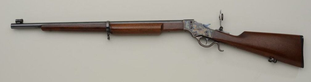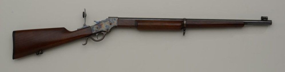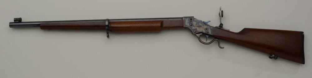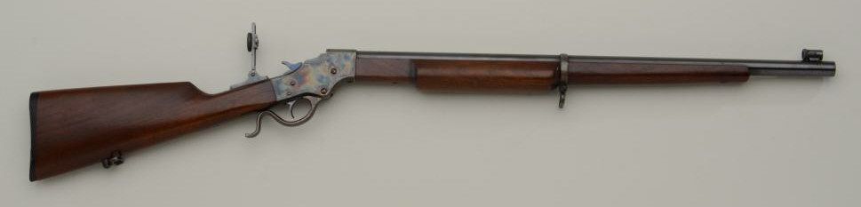 Stevens Walnut Hill .22 long rifle caliber single shot rifle in fine to excellent condition with target type tang sight and covered front sight, serial number 71082. The barrel shows 95% to 98% of original brightblue finish thinning slightly with some slight losses at the muzzle. The frame shows 90% to 95% original bright case hardening which is aging only slightly and toning very minimally. The majority of the color on theframe is vibrant. The stocks are very good plus to near fine with one or two minor dings and one major ding right in front of the front sling swivel. The frame shows factory milled for a receiver sight which has beenremoved long ago. The original butt plate is retained and the barrel band shows traces of original finish. A strong 9.5 on 1 to 10 scale. Est.: $1500- $3000