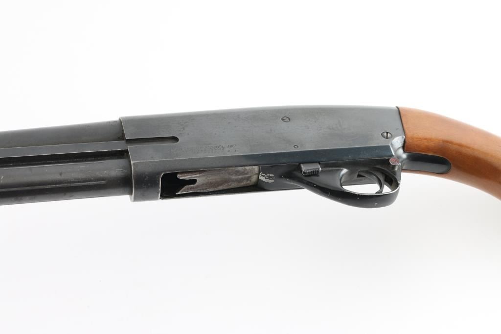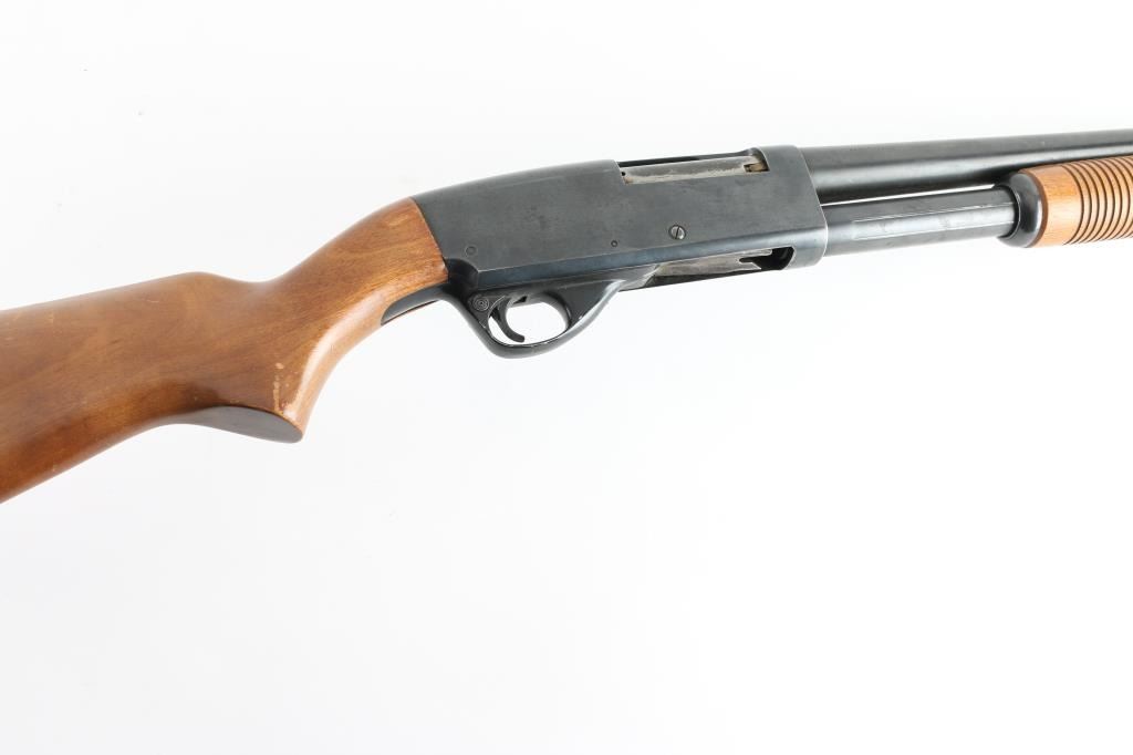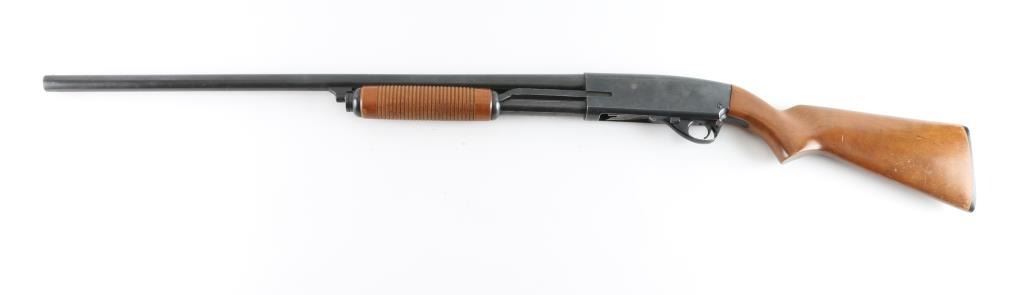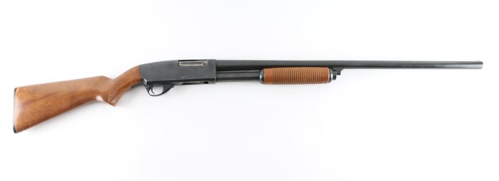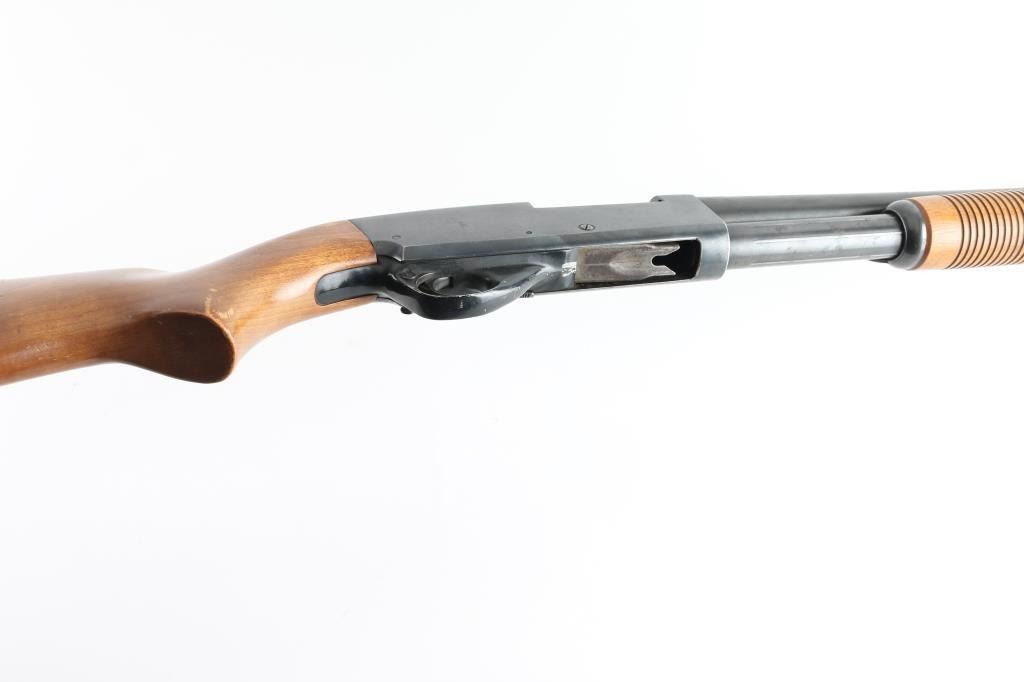 American made (Circa 1960) tube fed slide action shot. 3" chamber, light modified factory choke. LOP is 14" Features a blued finish, 28" barrel. bead front sight, half-length tube magazine, smooth trigger, push button safety, ribbed wood slide handle and pistol grip shoulder stock with serrated black plastic buttplate. Shotgun exhibits approximately 94% of it's original blued finish showing light wear, some scuffing on barrel, and some very minor spots of rust. Plastic triggerguard is scuffed. Action is smooth, the bore appears very good/bright, and the wood stocks are sound, shows many small scratches, and some finish loss above the buttplate. Condition is NRA Very Good. C&R firearm