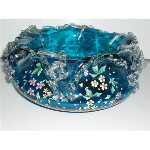 This is a 19th century Victorian blue glass bowl with floral enamel decoration by Stevens & Williams . There are six handles on the bowl which are in an applied crystal flowers and leaves. A part of one handle is has applied decoration broken off (see photo), not too noticeable because of all of the ornate applied decoration for the handles and a crack on one edge (see photo). Additionally, 5 of the six handles have applied crystal flowers and only one does not have a broken petal. Still, I have not seen one so beautiful. Measures 11 inches in diameter and 4.5 inches high. Weighs just shy of 5 pounds.