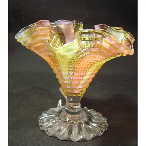 Stevens & Williams Rainbow Parfait 1890 - 1910. This is a fabulous piece the way it is made. It is crimped six times to form its shape. At the side of the parfait the top three lines of applied glass are smooth, without pattern, and the rest of the lines of applied glass are indented or crimped all the way around and down to the bottom. This is done by a special machine that was invented during this period. The parfait sits on a crystal multi-crimped base. Incorporated into the green glass is white and pink verticle stripes. It is 5" tall and 5 1/2" across at the top. No damage.