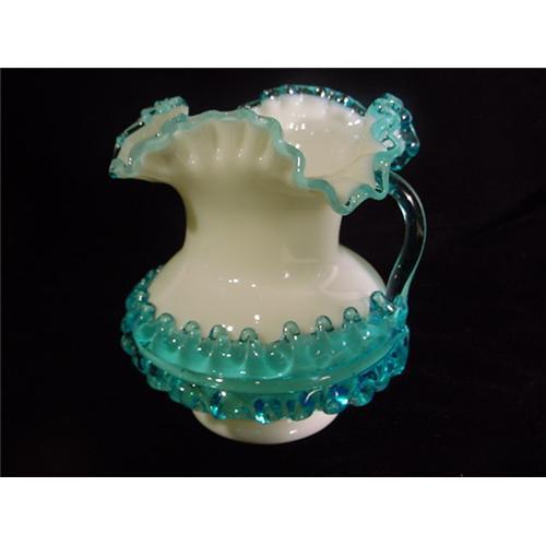 5 1/2 inch Tall ** 4 1/2 inch Diameter ** Creamy White Opaque Body with Applied Blue Glass Feather Motif that Wraps a Little Over Half of the Bulbous Body ** Blue Edges on the Four Sided Ruffled Top ** Excellent Condition