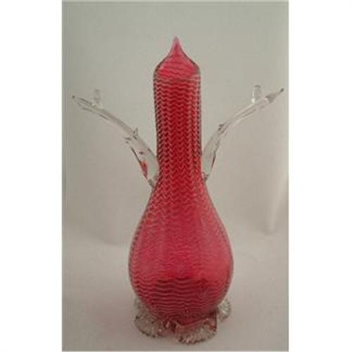 Stevens & Williams double thorned cranberry vase. This is true cranberry and not flashed. The vase is 11 1/2" tall. It has two outward stretched arms with glass thorns on both of them. The tips of both arms are sharp and were most likely made this way. Embedded into the cranberry glass are horizontal white glass that forms an unusual pattern. It goes from the bottom to the top. The swirl pattern is also on the underneath portion of the vase where there is a sharp pontil mark indicating that this piece was hand blown. The vase sits on five large crystal tab feet that have no damage to them. This is a quite unusual find and a very attractive vase.