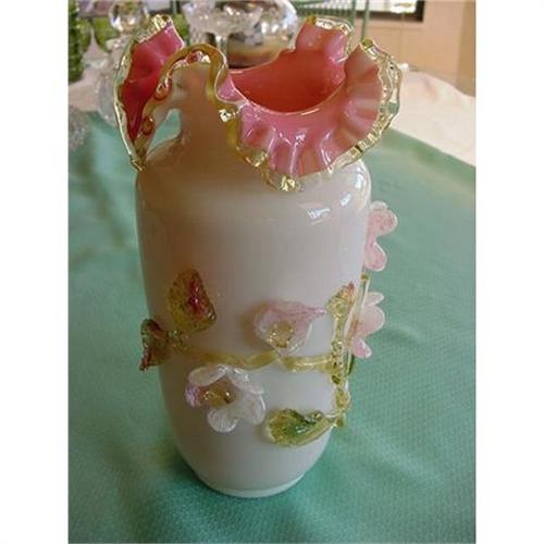 9 1/2 inch Tall ** White Opaque Glass Cased with Pink ** Mat-su-Noke Decorations in Pink, Green, Mottled White and Amber ** One Flower has Petals Missing but is a real Beauty ** Circa Late 1800s