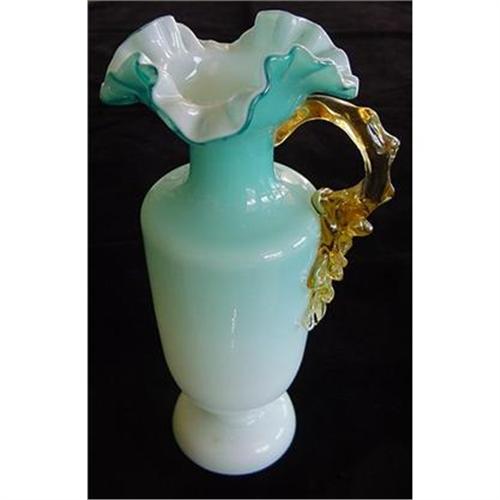 7 1/2 inch Tall Vase ** Beautiful Blue Color Shaded from Light Blue at Bottom to Deeper Blue at Ruffle Top with Amber Rigaree Handle ** Excellent Condition