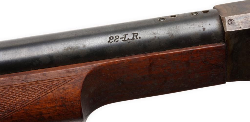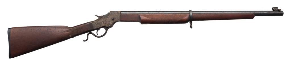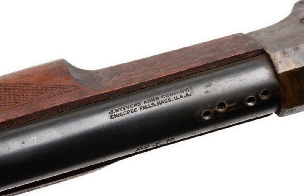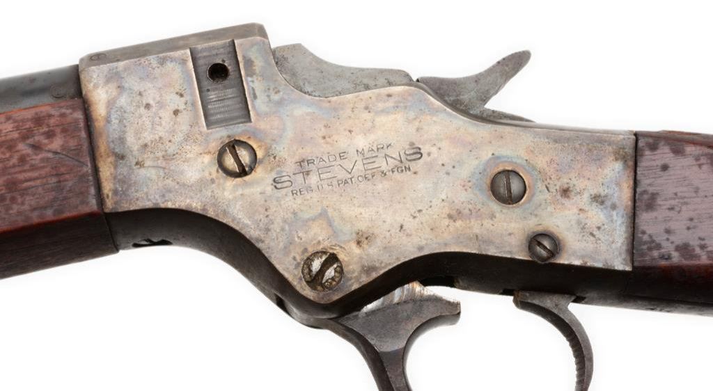 *Stevens falling block single shot rifle, .22LR caliber, 26” round barrel, S/N 73485, blued and case hardened finish, checkered wood stocks in overall un-cleaned condition; considerable original blue and case colors under layer of grime, very good bore, good action. Barrel shows a number of tapped holes for scope mounts with front adjustable hooded sight present. The wood fore stock is good; the butt stock has a couple of chips at the upper tang and two drilled holes. Some careful cleaning and TLC should improve this gun’s appearance considerably. Est.: $150-$300.