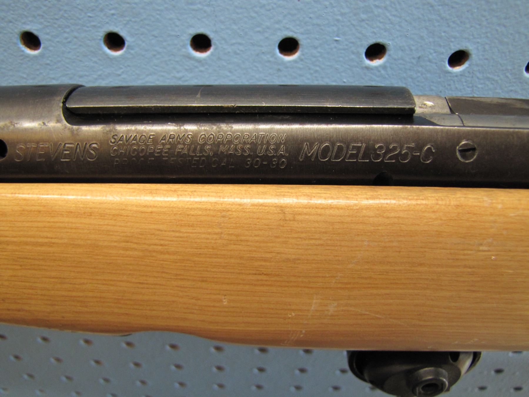 Stevens model 325- C, 30 30 calibre, bolt-action, no clip, some Rust present on Barrel