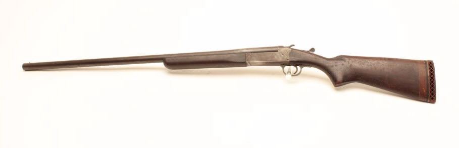 Stevens single shot shotgun, 12 gauge, Serial #NSNV. The shotgun is in fair overall condition with a 30” barrel with a steel bead front sight. The barrel retains a significant amount of muted blue finish withthe remainder a dark patina. The receiver has become a brown patina with some areas of old, toning case hardening. The smooth wood stocks are in fair condition with a spacer and ventilated pad added providing a 14” LOP. The bore is good, the action crisp and markings are legible. Est.: $50-$100. (Modern).