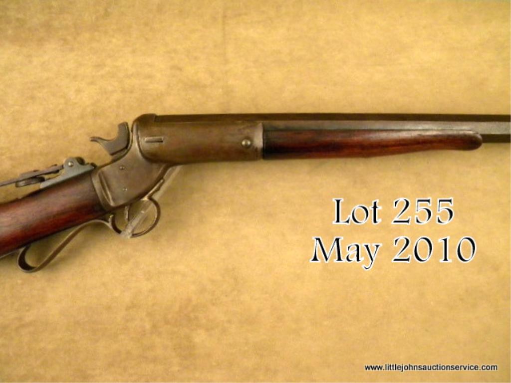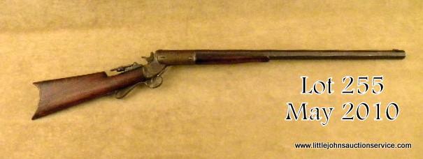 Stevens tip-up .25 caliber rimfire single shot rifle, 26" medium to slightly heavy weight barrel, made with forend, showing veneer-type tang sight, serial #5325. The barrel measures approx. 7/8" across the flat of the muzzle, and the gun remains in original good condition with blue brown patina finish on barrel, frame drifted to brown. Some light patina, scattered erosion, good markings, beginning pinprick pitting. "26" is engraved on the left side of the frame, probably ID from ashooting club or gallery. The wood is lightly refinished, otherwise good. The bore is slightly rough, the action tight. Generally good overall with a period sight that is adjustable for windage and elevation. Est: $250 - $500
