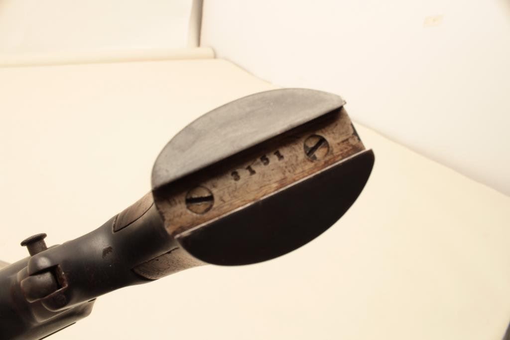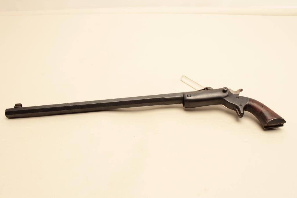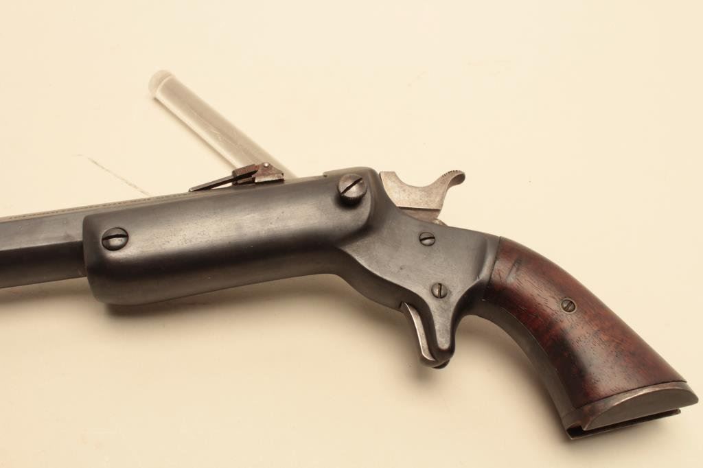 mat black to metal surfaces, cut for shoulder stock (no stock), wood grips, S/N 3151, in overall good condition as re-finished; good bore, good action, good markings and good grips. (Antique). Est.: $500-$1,000.