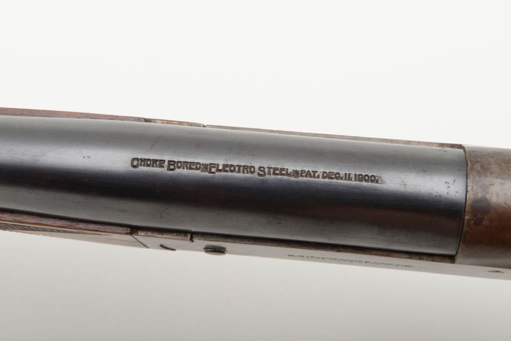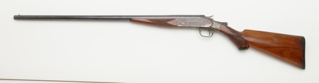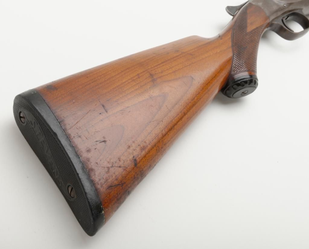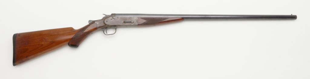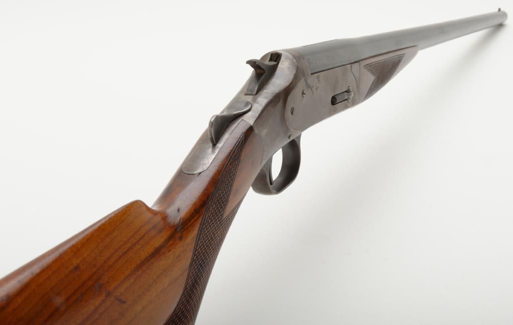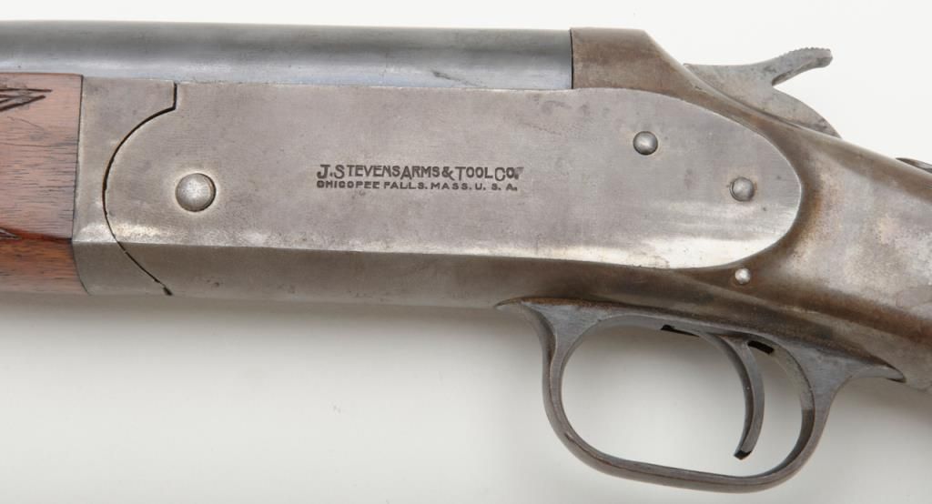 Stevens tip-up single shot shotgun, 20 gauge, 28” barrel, blue and case hardened finish, checkered wood stocks, #819. This gun is in overall very good condition showing the majority of its muted blue finish on the barrel and brown patina on receiver, good bore, action, markings and wood; correct Stevens butt plate. Est.: $60-$120.