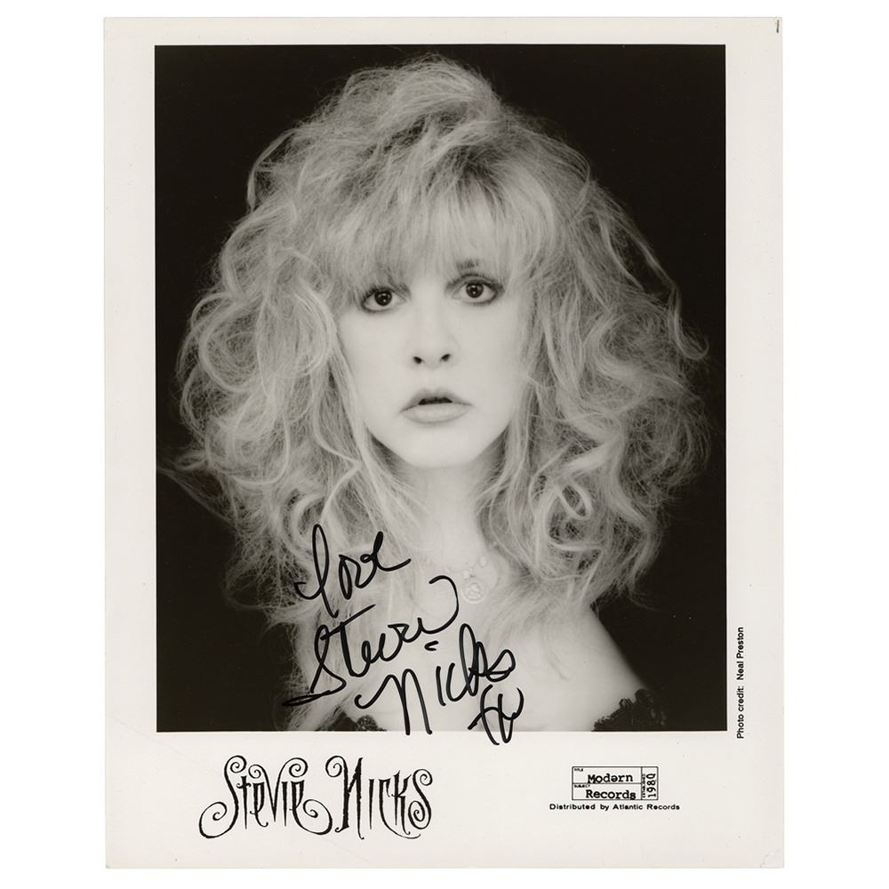 Glossy 8 x 10 Modern Records publicity photo of Nicks in a front-facing pose, signed in black felt tip, "Love, Stevie Nicks, xx." In very good to fine condition, with scattered light creasing, and a heavier diagonal crease in the bottom border.