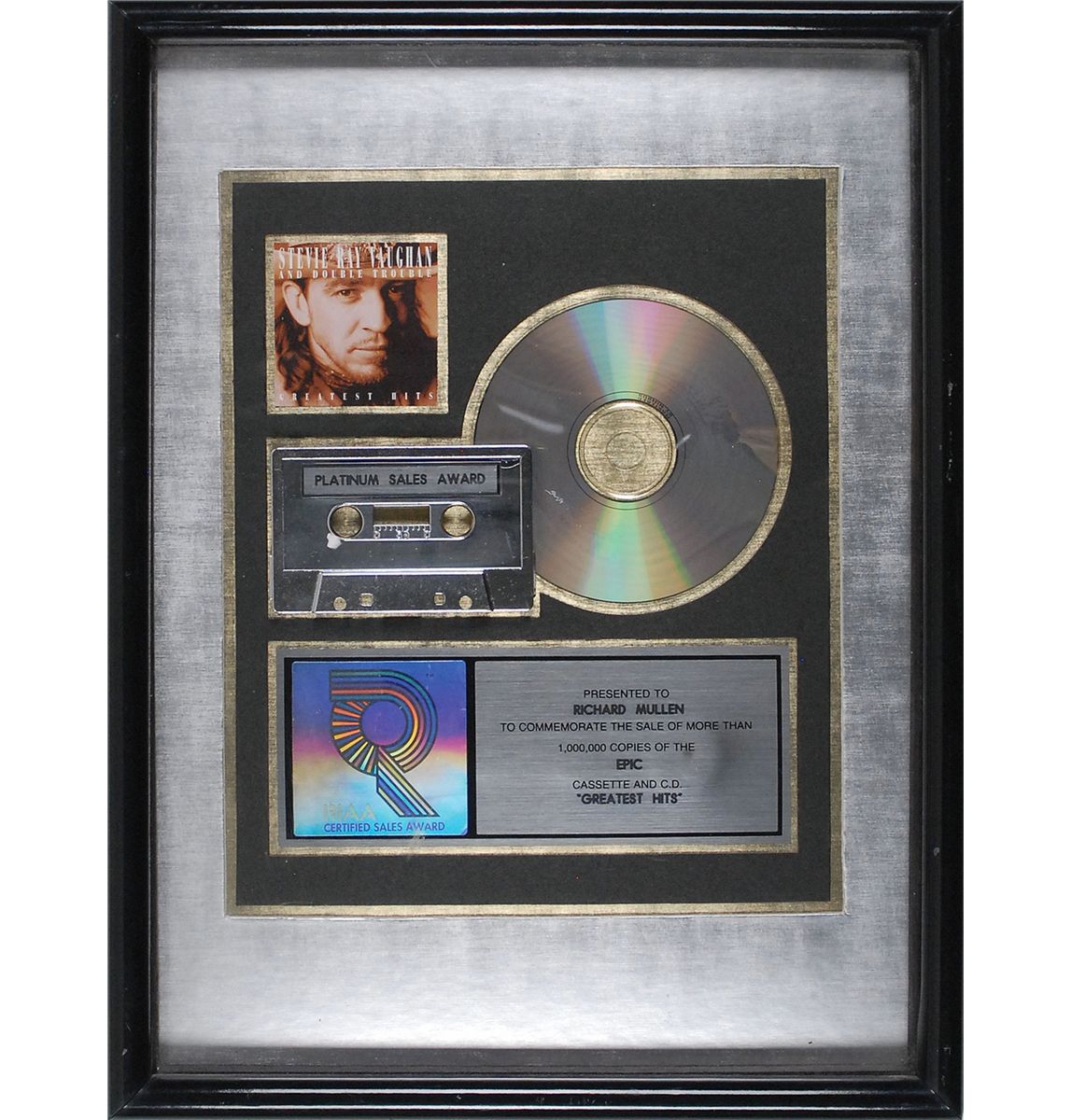 RIAA ‘R’ Hologram platinum sales award presented to Richard Mullen “to commemorate the sale of more than 1,000,000 copies of the Epic cassette and C.D. ‘Greatest Hits’” by Stevie Ray Vaughan and Double Trouble. Framed with the platinum disc and cassette, engraved plaque, and image of the album cover to an overall size of 13 x 17. In fine condition.