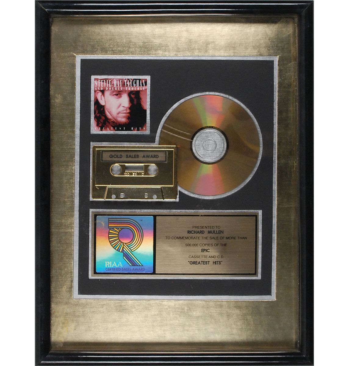 RIAA ‘R’ Hologram gold sales award presented to Richard Mullen “to commemorate the sale of more than 500,000 copies of the Epic cassette and C.D. ‘Greatest Hits’” by Stevie Ray Vaughan and Double Trouble. Framed with the gold disc and cassette, engraved plaque, and image of the album cover to an overall size of 13 x 17. In fine condition, with some slight peeling to frame’s edges.