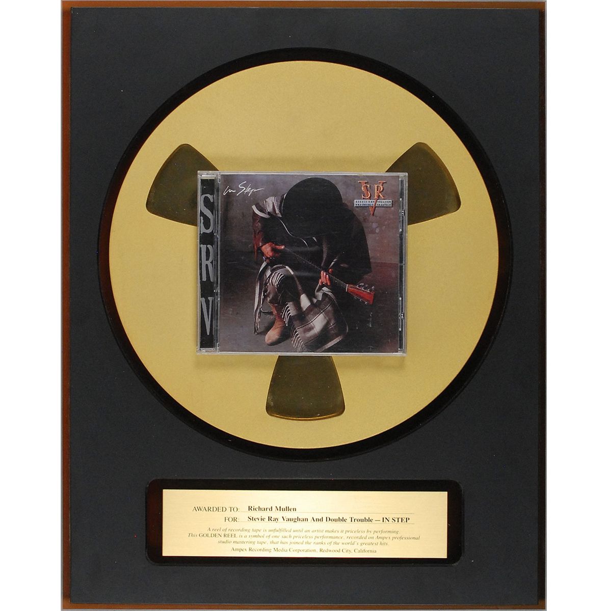 An Ampex Golden Reel award presented to “Richard Mullen for: Stevie Ray Vaughan and Double Trouble—In Step,” consisting of the CD affixed to a gold reel, presented on a plastic 13.5 x 17 plaque with an engraved plate describing the award: “A reel of recording tape is unfulfilled until an artist makes it priceless by performing. This Golden Reel is a symbol of one such priceless performance, recorded on Ampex professional studio mastering tape, that has joined the ranks of the world’s greatest hits.” Reverse bears an affixed California Gold Record Co. label. In fine condition, with a few marks and scratches to the CD’s jewel case. Released in 1989, In Step was Vaughan’s final album with Double Trouble.