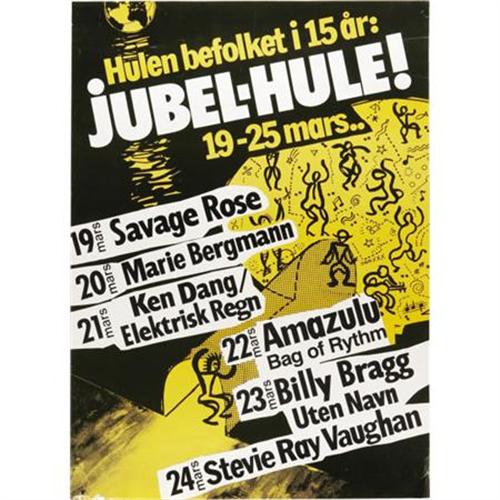 <B>Stevie Ray Vaughan Jubel-Hule Norway Concert Poster (1984).</B></I> This modern-primitive poster, printed in black, white, and yellow, documents Stevie Ray Vaughn's March 24, 1984 gig in Norway. Billy Bragg opened for Stevie, who is ironically last-billed on this poster, which measures approximately 15 5/8" x 22 2/16". In VG+ condition.<BR><BR><b>Shipping:</b> Flat Material, Large (<a target="_blank" href="http://www.heritageauctions.com/common/shipping.php">view shipping information</a>)